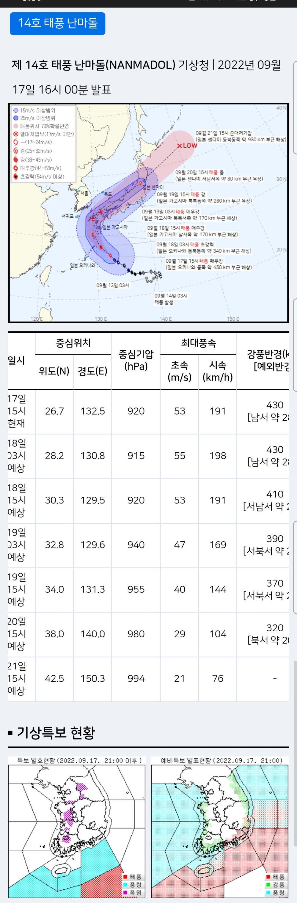 2022.9.17. 제 14호 태풍 난마돌. 18일 일본상륙. 한국 경남지방이 영향권 본문