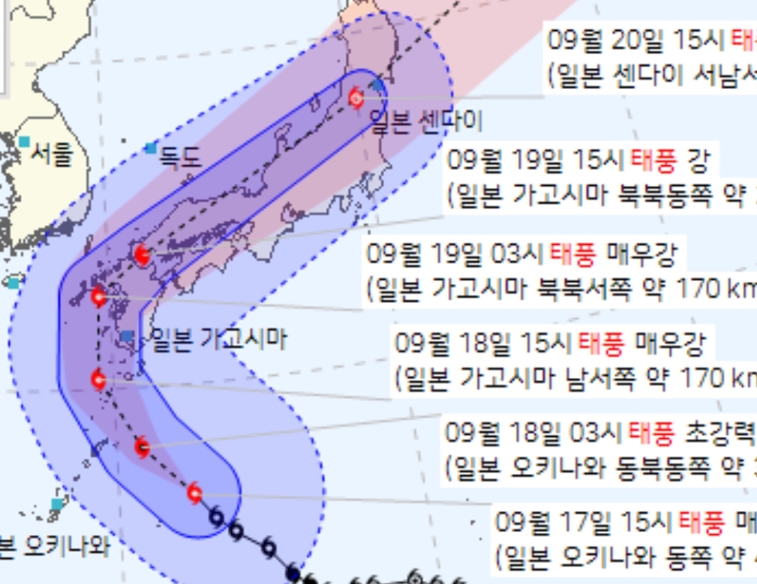 오키나와와 일본본토사이를 지날 때는 초강력으로 커졌다 다시 매우강으로 내려간 등급으로 내일(18일) 일본 큐슈에 상륙, 강 등급으로 약화된 뒤 혼슈 북부해안을 따라 이동할 것이라 합니다. 그래서 센다이쪽으로 해서 혼슈 북동해안으로 빠져나갈 전망이라고.