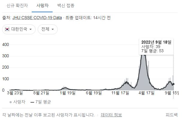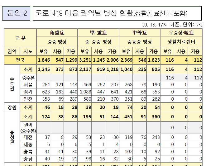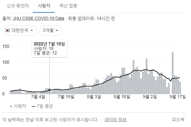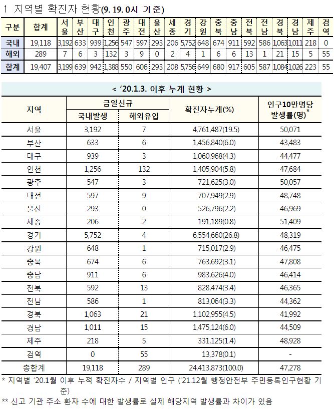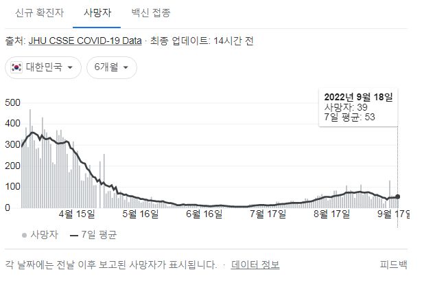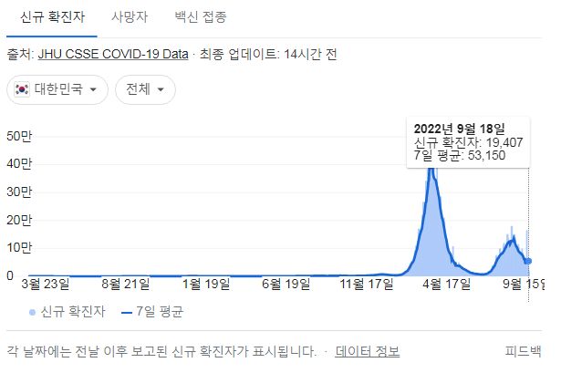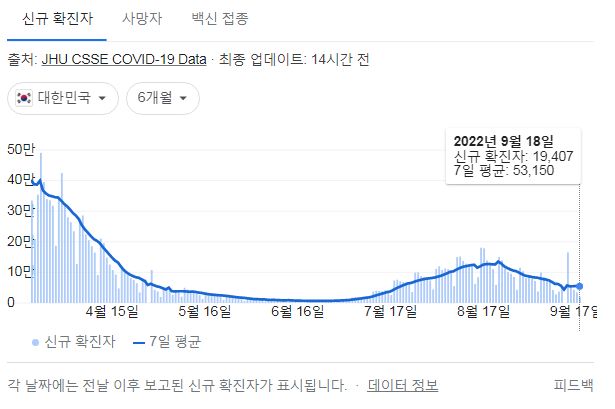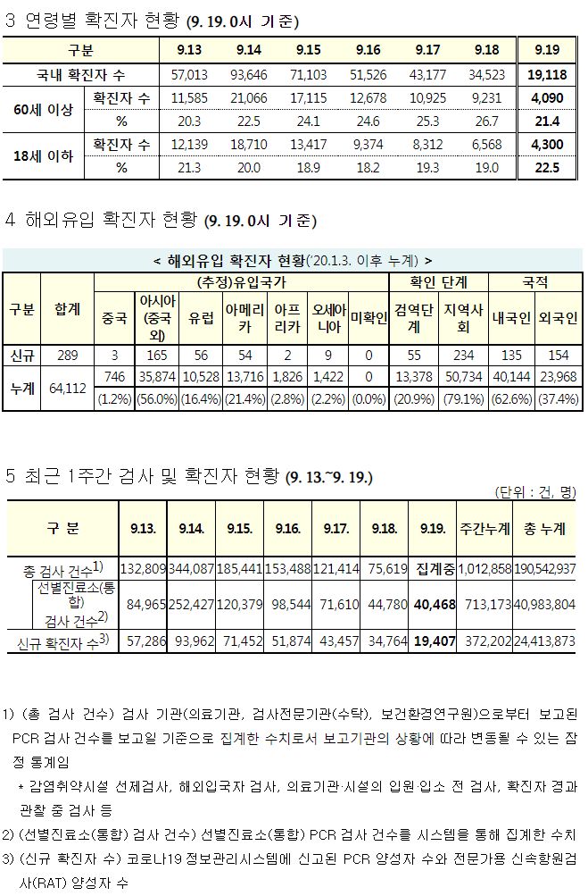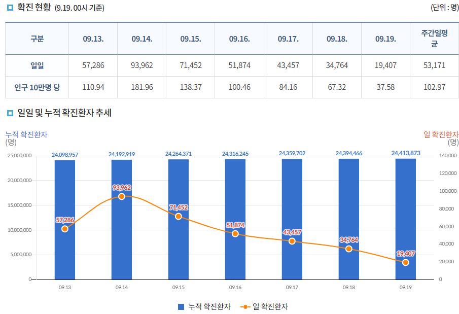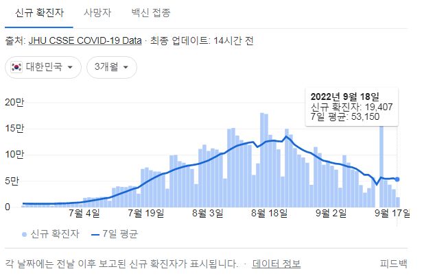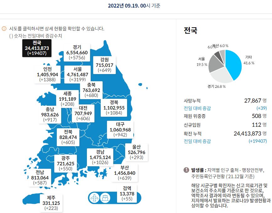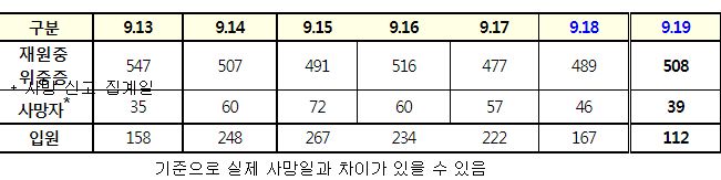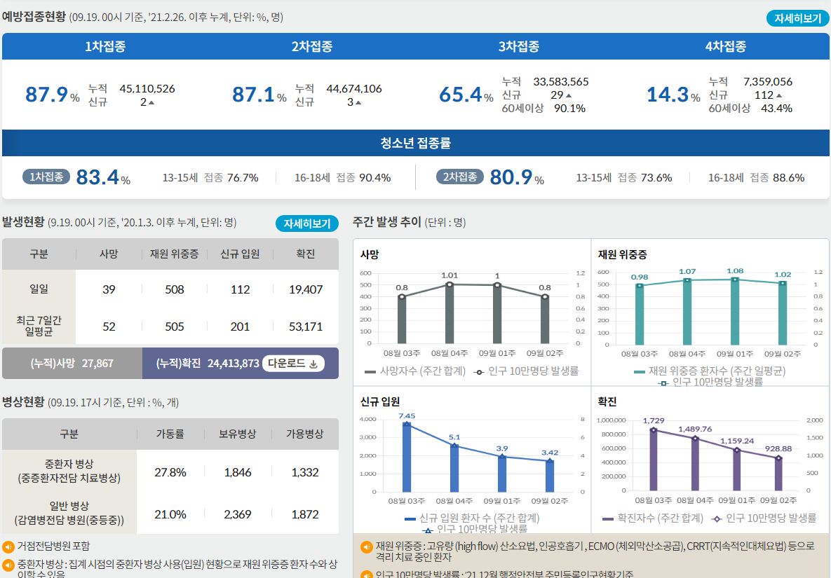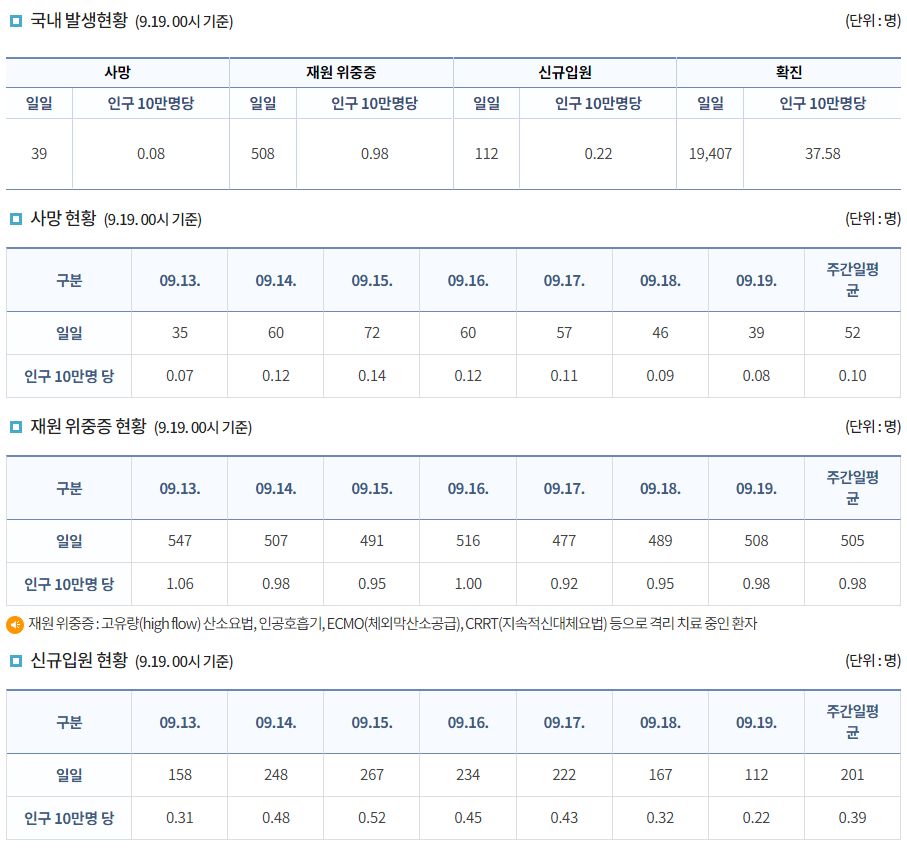 코로나19집계(2022.9.19. 0시기준) 확진 +1.9만, 사망 +39명, 중환자병상가동률 28%, 재택치료 31만 본문