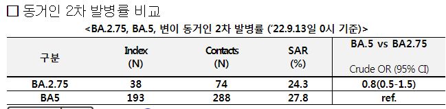 ○ BA.2.75 변이바이러스는 62일(7.13~9.13) 동안 152명(9.10일 검출률 1.3%) 확인, BA.5 변이(46일(5.15~6.30) 동안 396명, 7.2일 검출률 29.2%) 대비 느린 점유 속도