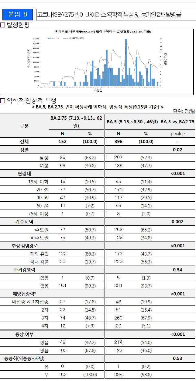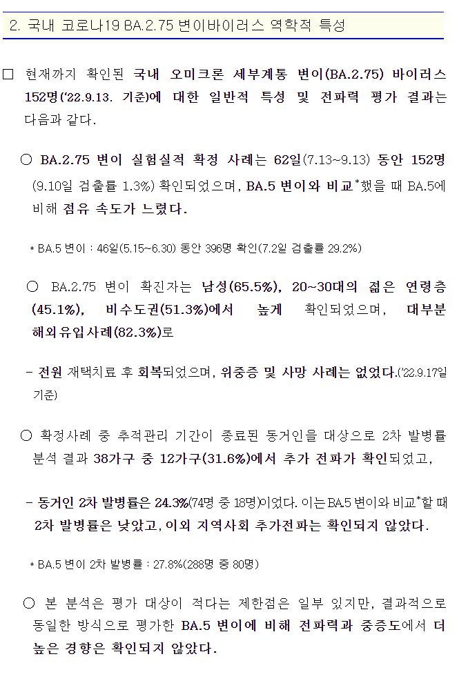 □ 국내 오미크론 변이(BA.2.75) 바이러스의 역학적 특성