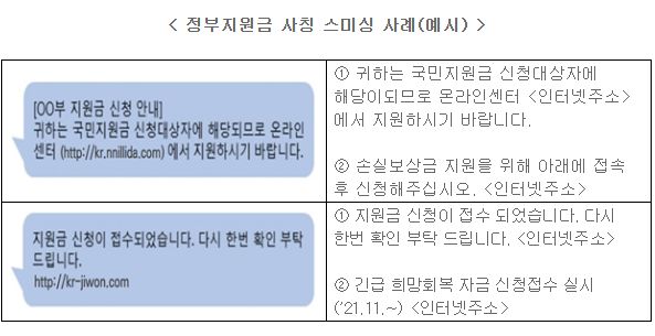 대환대출, 생계자금지원, 정부 정책자금(출연금)지원, 코로나19지원금, 자영업 지원금, 파산지원, 개인회생지원, 햇살론, 청년대출, 그 밖에도 수많은 그럴 듯한 이름을 빙자해 보냅니다. 사칭하는 기관도 정부 xx위원회, 서울보증보험, 주요 시중은행, 농협, 주요 저축은행, 카카오뱅크같은 인터넷전문은행 등을 가리지 않습니다.