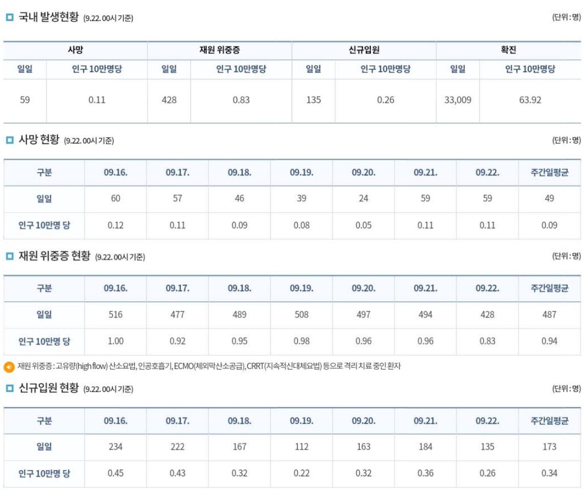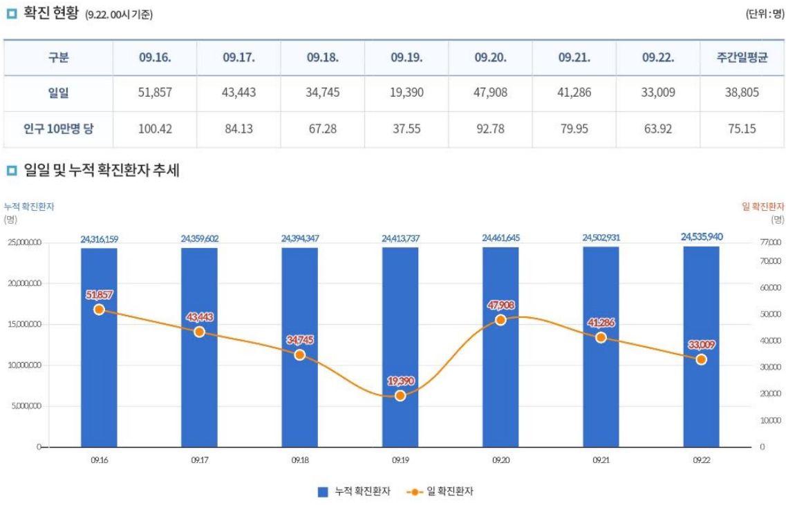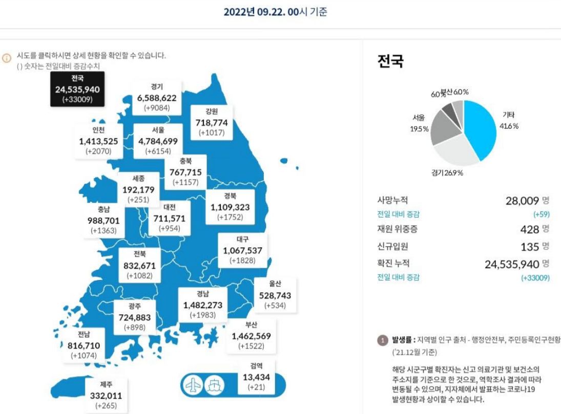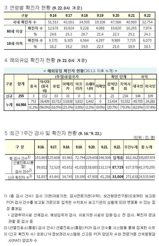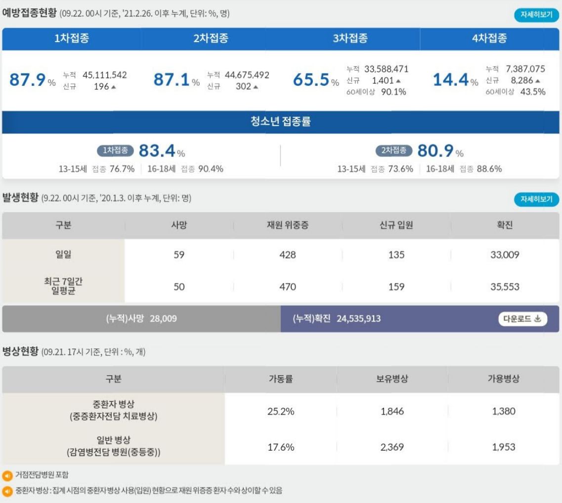 코로나19집계(2022.5.22. 0시기준) 확진 +3.3만, 사망 +59명, 중환자병상가동률 25%, 재택치료 22만 /:/ 주간 코로나19 예방접종 현황(9.15.~9.21.) 본문