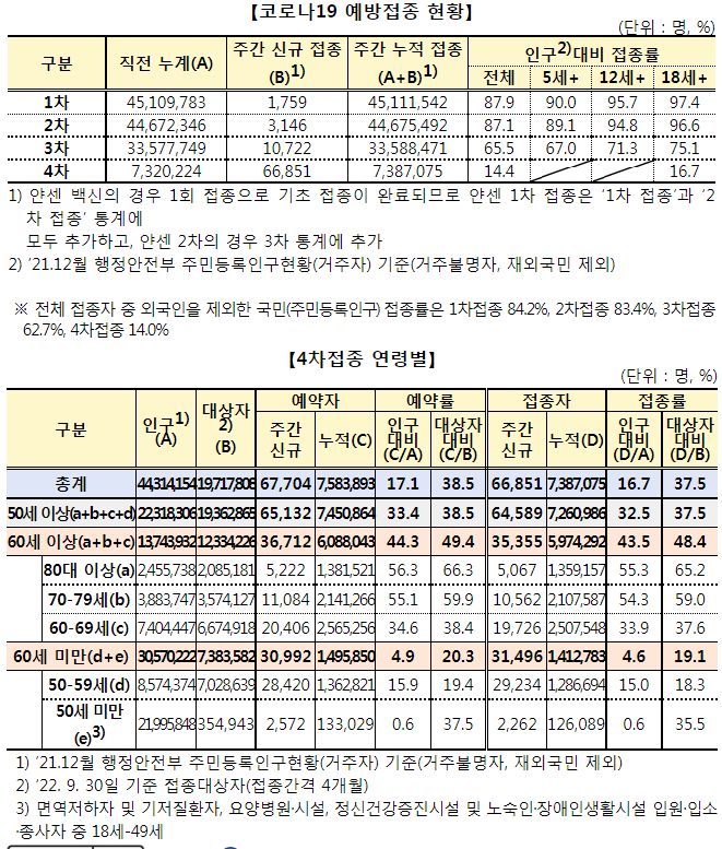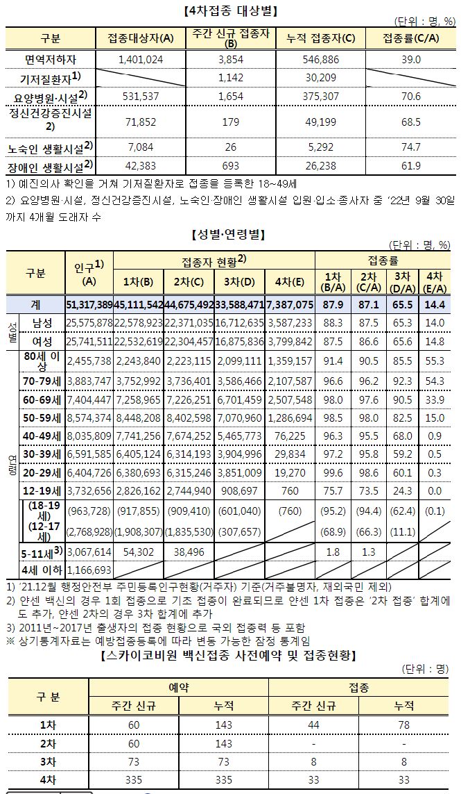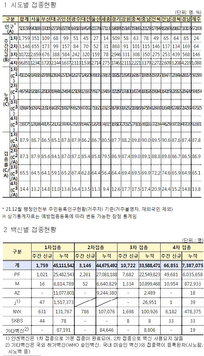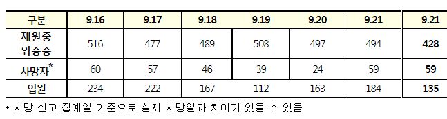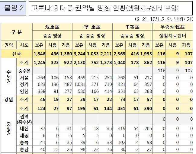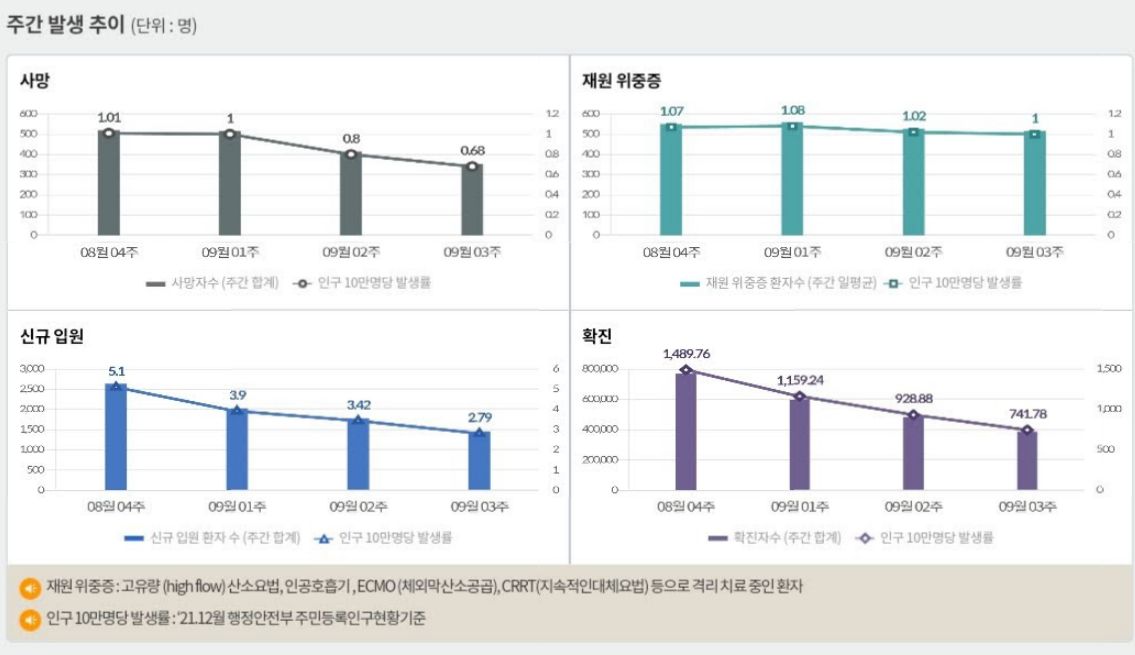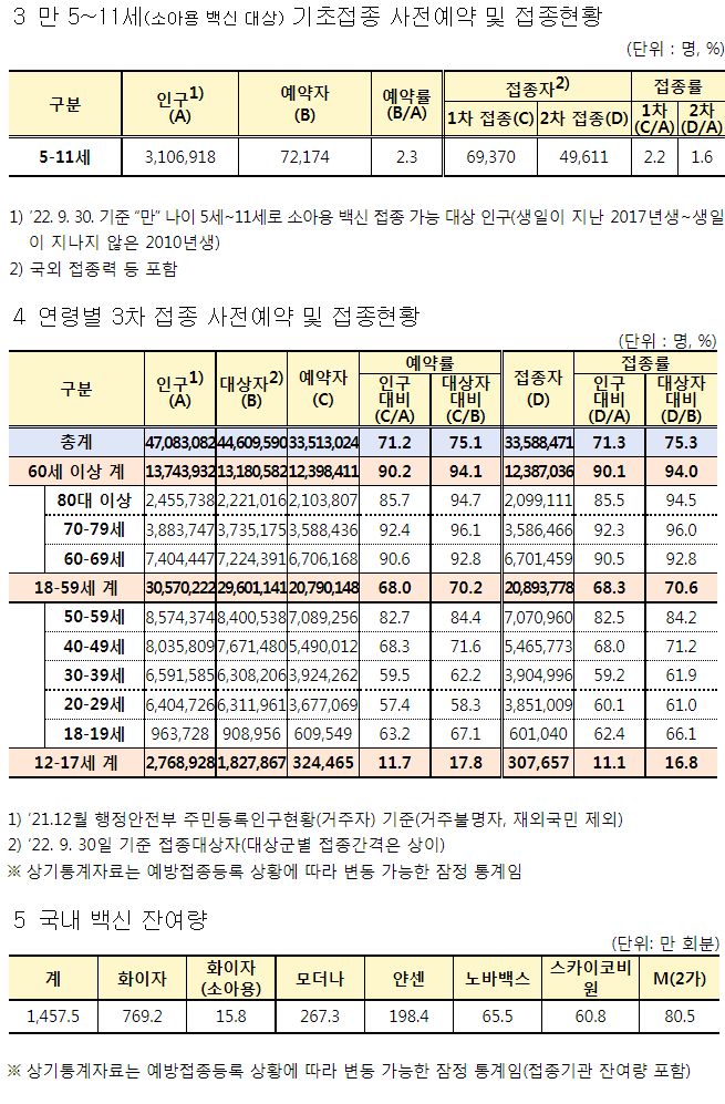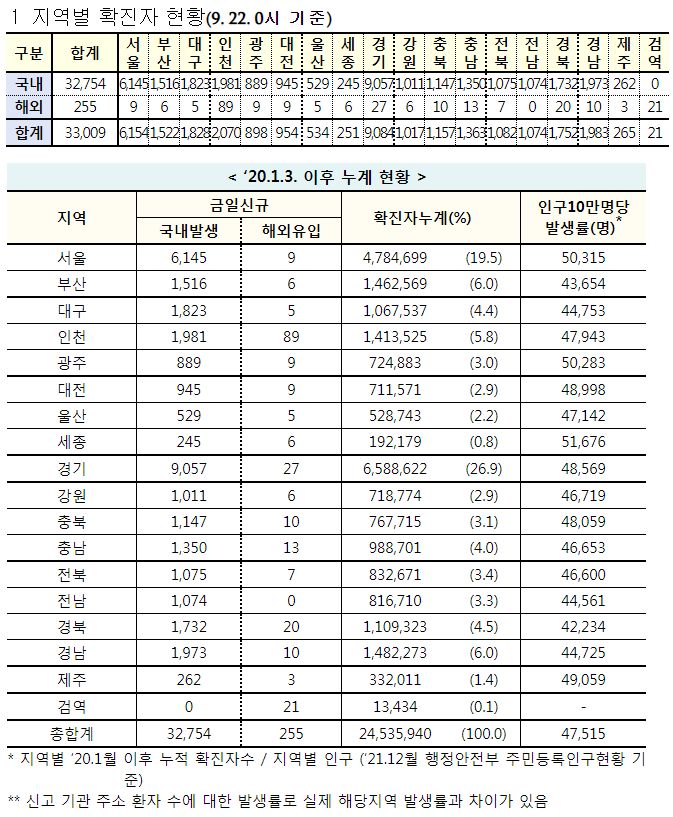 코로나19집계(2022.5.22. 0시기준) 확진 +3.3만, 사망 +59명, 중환자병상가동률 25%, 재택치료 22만 /:/ 주간 코로나19 예방접종 현황(9.15.~9.21.) 본문
