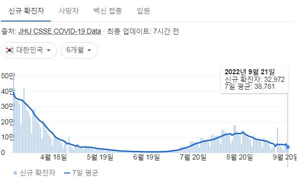 코로나19집계(2022.9.21. 0시기준) 확진 +4.1만, 사망 +59명, 중환자병상가동률 27%, 재택치료 24만 (0) | 2022.09.21 |