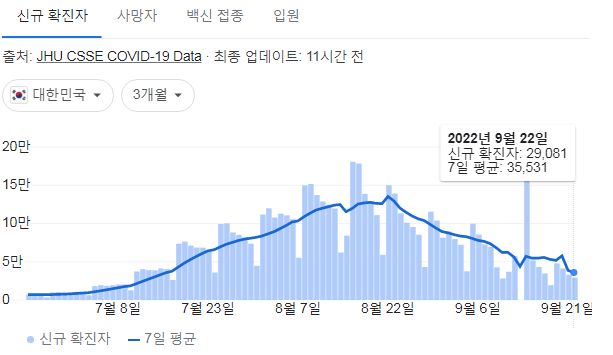 | 코로나19집계(2022.9.21. 0시기준) 확진 +4.1만, 사망 +59명, 중환자병상가동률 27%, 재택치료 24만 (0) | 2022.09.21 |