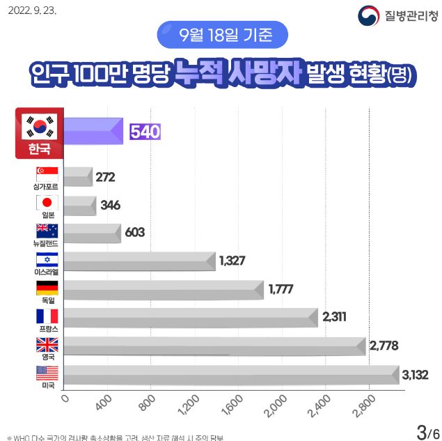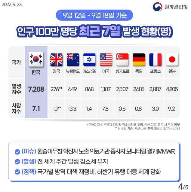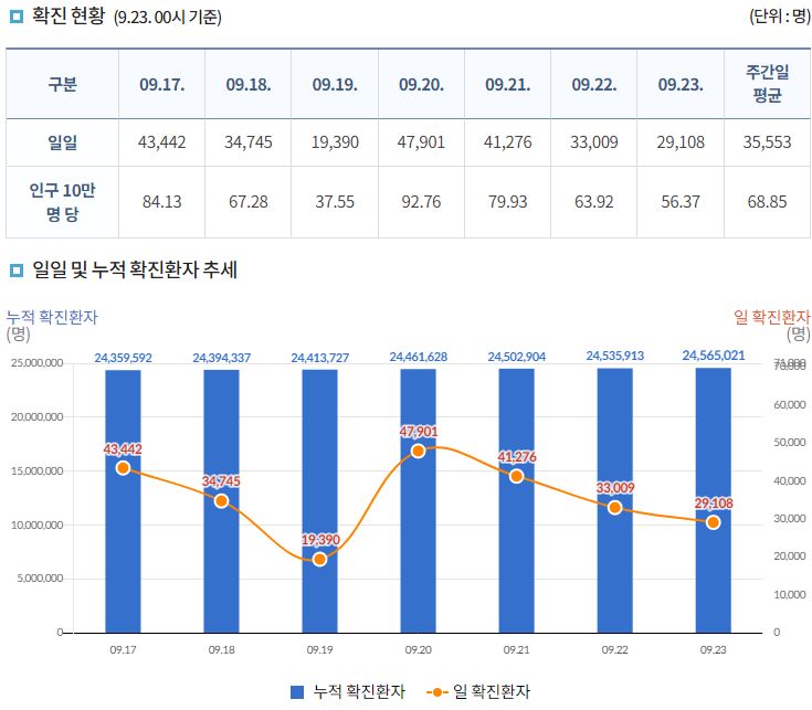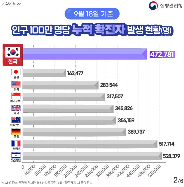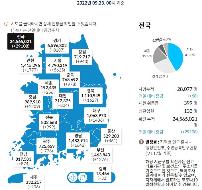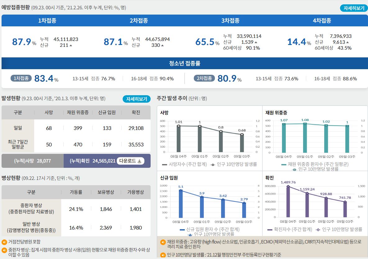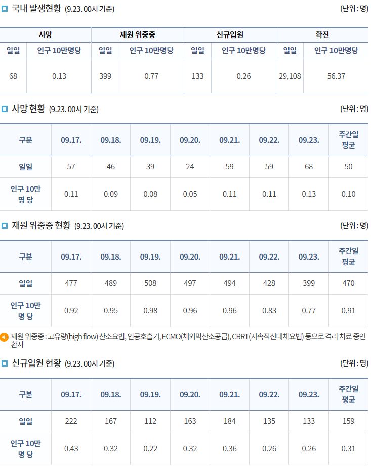 코로나19집계(2022.9.23. 0시기준) 확진 +2.9만, 사망 +68명, 중환자병상가동률 24%, 재택치료 21만/:/ 해외 주요 국가 방역 현황 통계(카드뉴스) 본문