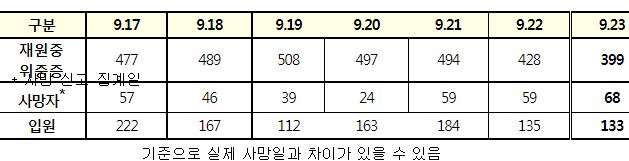 | 코로나19집계(2022.9.24. 0시기준): 확진 +3.9만, 사망 +63명, 위중증병상가동률 24%, 재택치료 20만 (0) | 2022.09.24 |