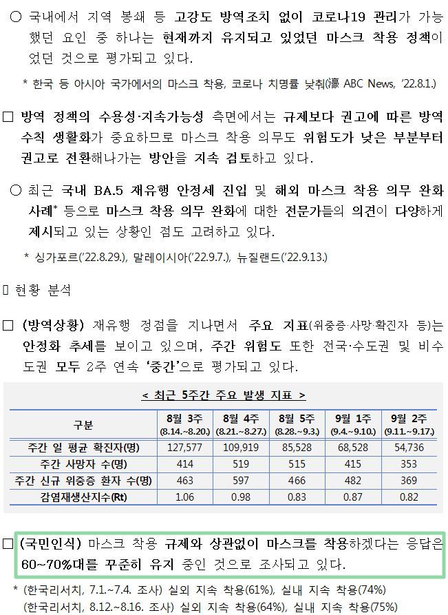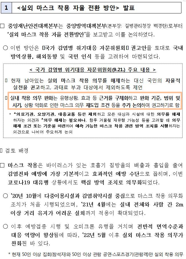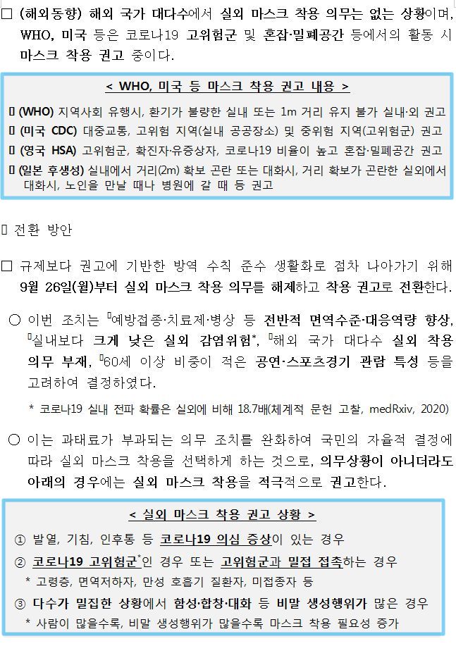 - 9월 26일(월)부터 실외 마스크 착용 의무를 해제하고 착용 권고로 전환