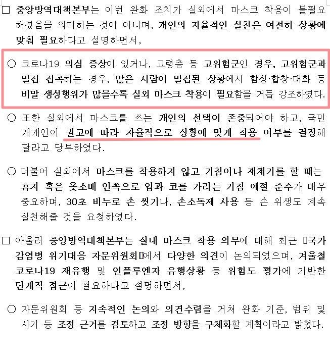 실외착용의무가 풀렸다는 것이며, 실내와 대중교통을 이용할 때 착용할 의무는 유지됩니다.