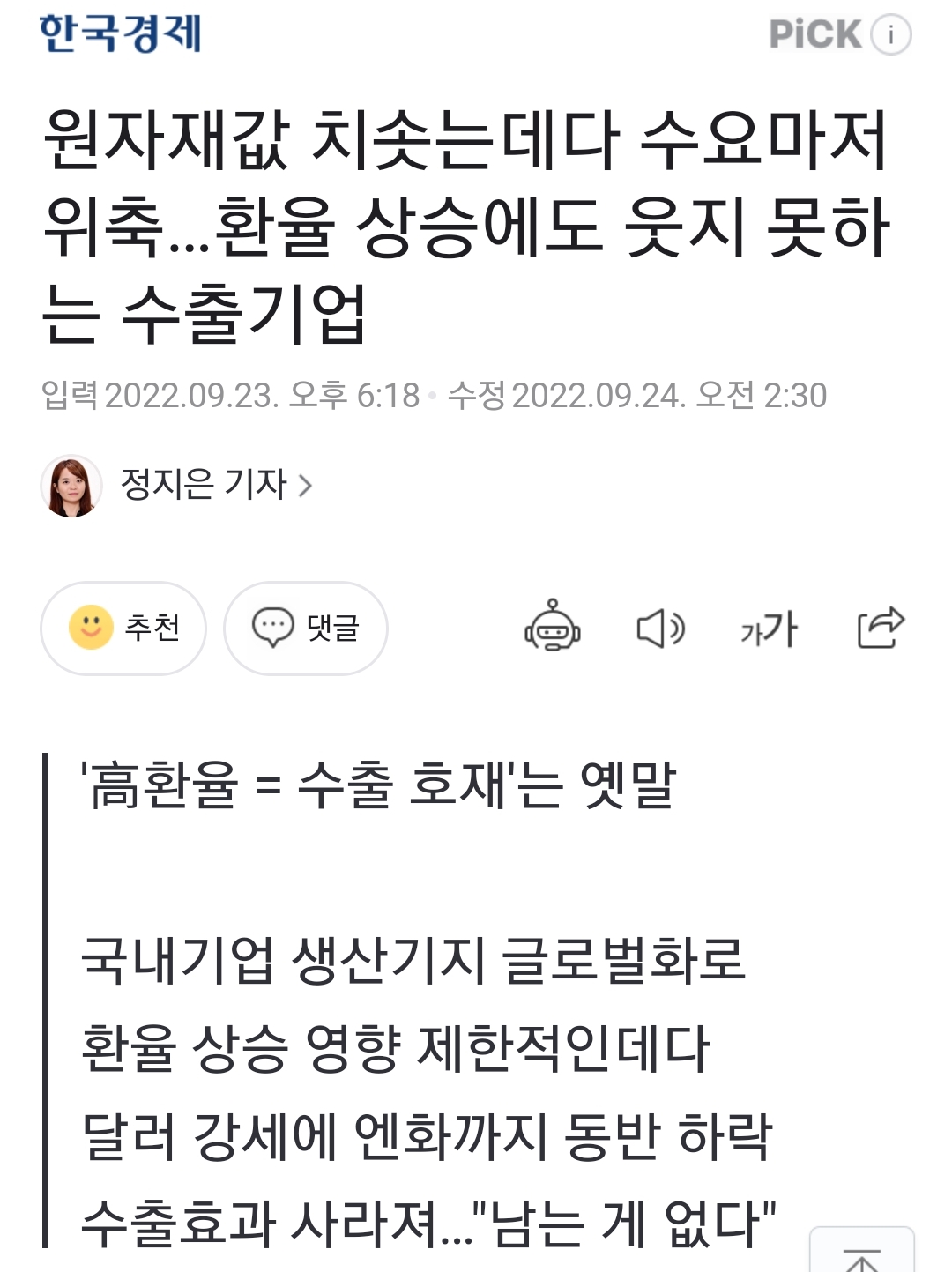인용한 문구처럼, 자국 환율가치를 낮게 잡으면 수출에는 유리하겠다는 게 짧은 생각이지만, 그건 그 나라의 무역구조에 따라 크게 다르다고. 우리나라 산업계도 요즘은 꼭 이득은 아니라는 기사가 따라붙었네요. 오히려 비상이라고..
