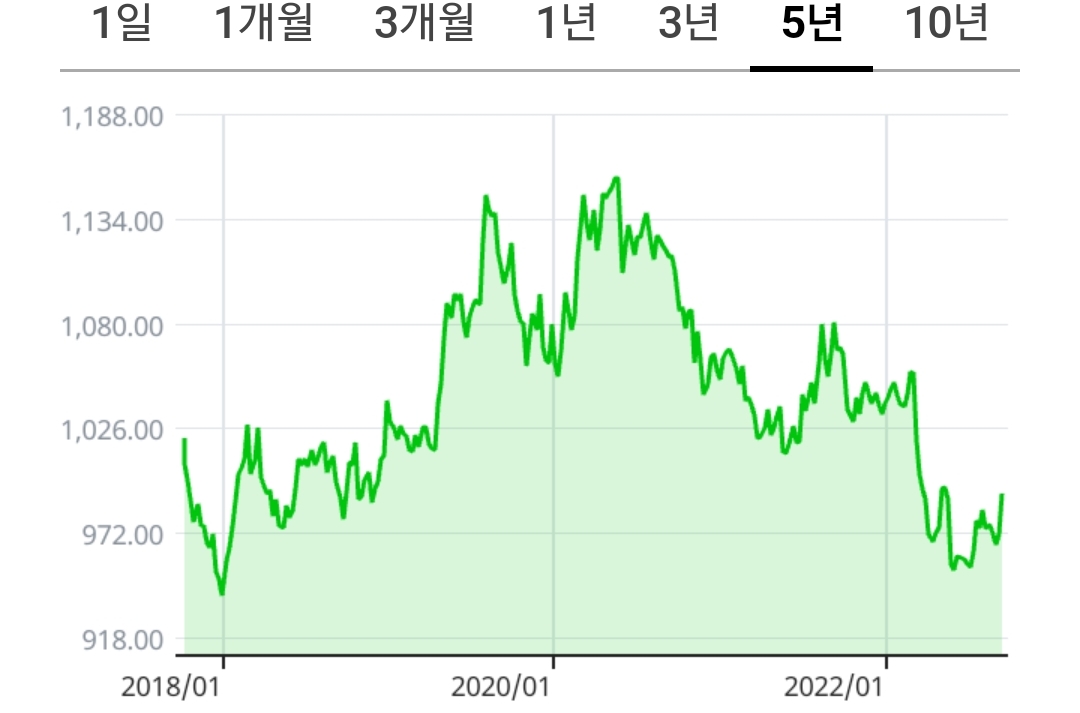 달러와 유로와 파운드가 거의 동렬에 섰네요. 그리고 위안화가 200원이군요.