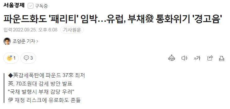영국 정부가 대규모 국채 발행을 전제로 한 70조 원대 감세 정책을 발표하면서 파운드화가 급락해 미국 달러와 가치가 동등해지는 ‘패리티’를 눈앞에 뒀다. 유럽 통화가치가 달러화 초강세,