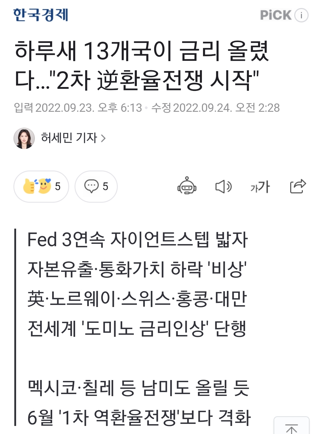 미국은 미국 인플레를 막기 위해 금리를 크게 올리고 있고, 다른 나라들은 달러 초강세 → 자국통화 초약세 = 자본유출과 수입물가 인플레이션을 막기 위해, 미국을 따라 큰 폭으로 금리인상기조.