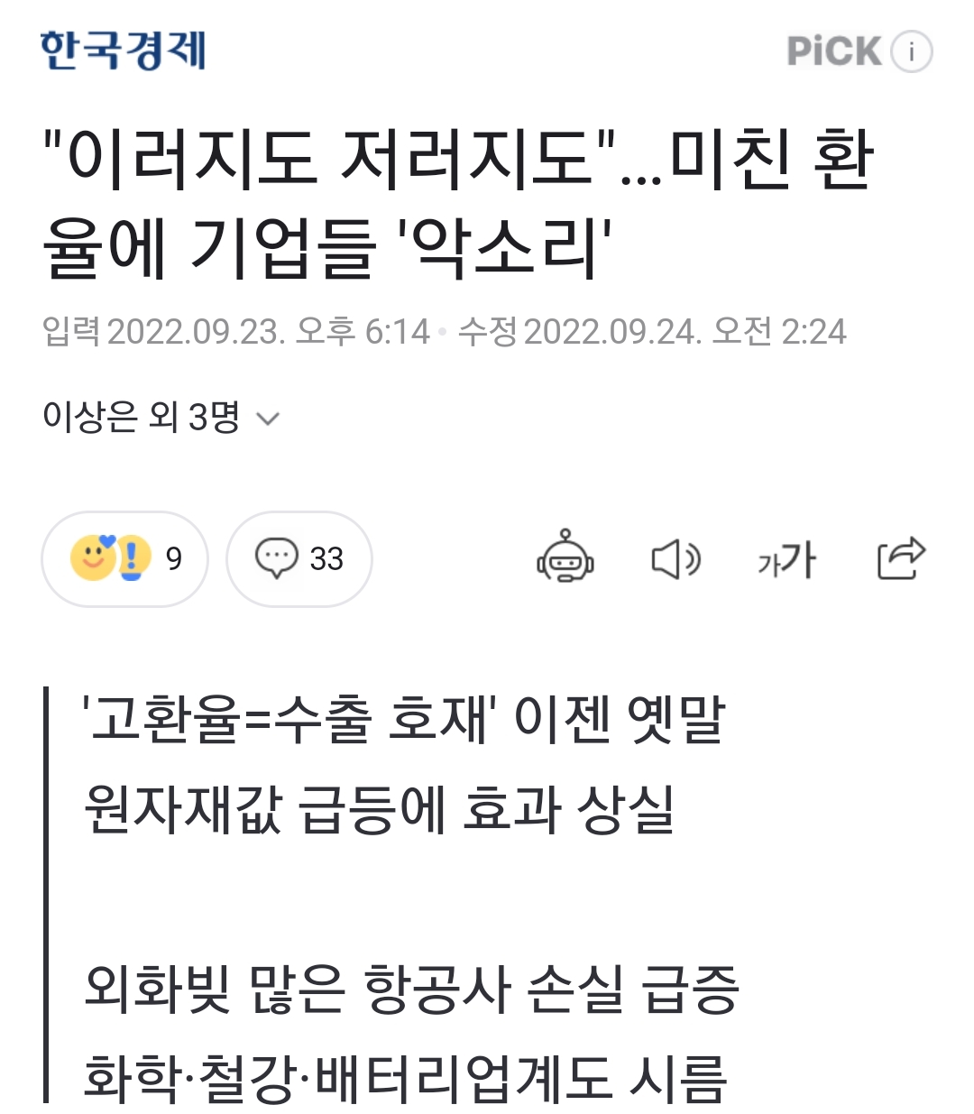 인용한 문구처럼, 자국 환율가치를 낮게 잡으면 수출에는 유리하겠다는 게 짧은 생각이지만, 그건 그 나라의 무역구조에 따라 크게 다르다고. 우리나라 산업계도 요즘은 꼭 이득은 아니라는 기사가 따라붙었네요. 오히려 비상이라고..