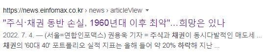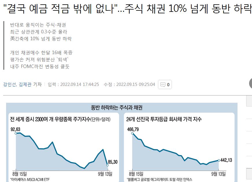 "미국" 금리인상이 너무 급하기 때문이라고.. 교과서적으로는 금리인상은 주식투자손실과 채권투자수익으로 반대결과를 내야 하지만 지금은 그렇지 않다... 이런 이야기. 그런데 "주식 채권 동반"이라고 구글검색해보면, 과거에도 몇 년 만에 이렇다, 동반하락이다, 동반상승이다같은 기사는 드물지 않게 보이네요. 잘 아는 사람들은 그걸 다 구별하는 모양입니다.