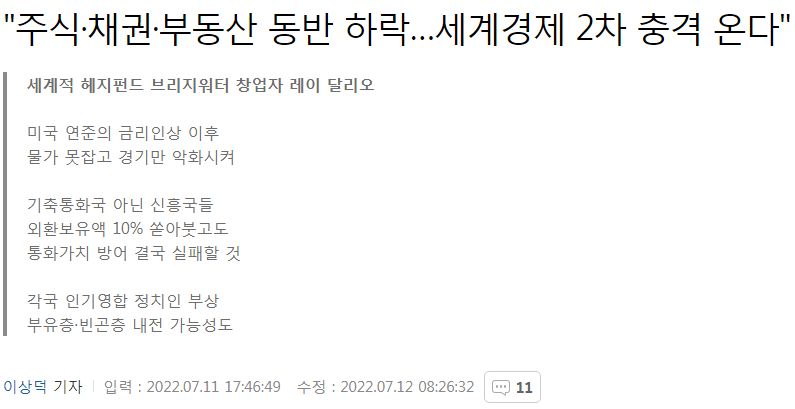 ㅡ "(인용한 미국기사 인터뷰) 통상적으로 경기침체 우려가 생기면 (미국)연준이 금리를 내려 경기를 살리지만, 지금은 40년 만의 인플레이션 때문에 연준이 금리를 올려야 하고 그 과정에서 채권값도 충격을 받고 있다”"