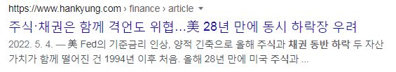"미국 중앙은행(Fed)는 기준금리를 대폭 인상하고 대차대조표 축소(양적 긴축)에도 속도를 낼 예정이다. 미 Fed의 영향으로 투자자들은 주식과 채권을 모두 내다팔고" - 한국경제신문 2022.5.4
