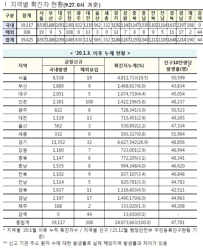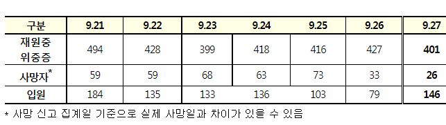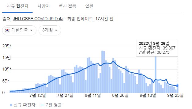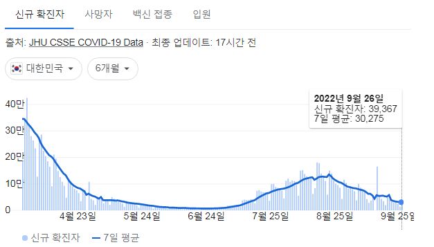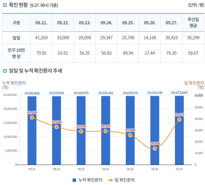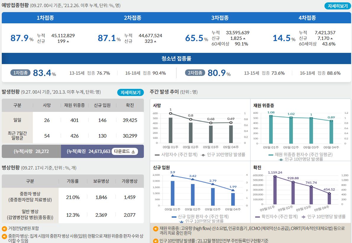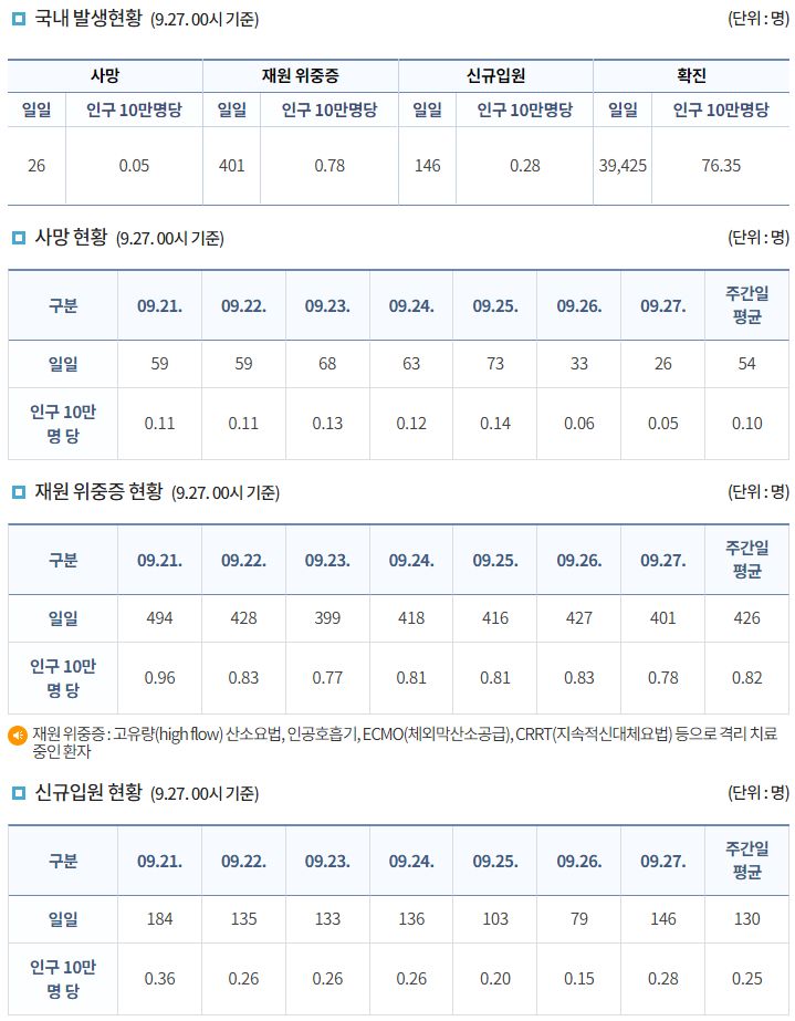 코로나19집계(2022.9.27. 0시기준) 확진 +3.9만, 사망 +26명, 중환자병상가동률 21%, 재택치료 17만 본문