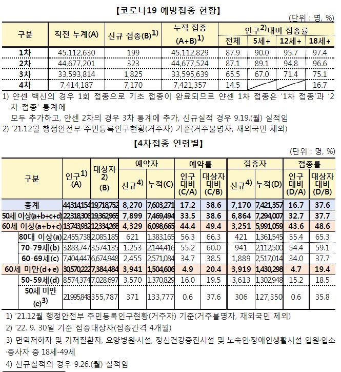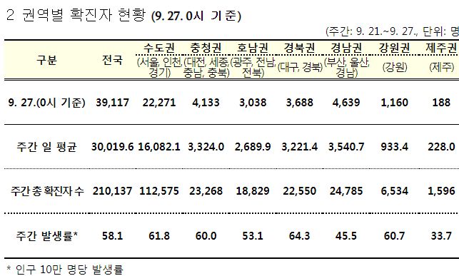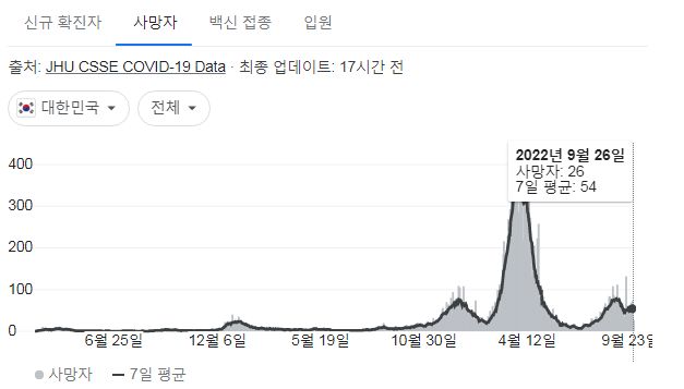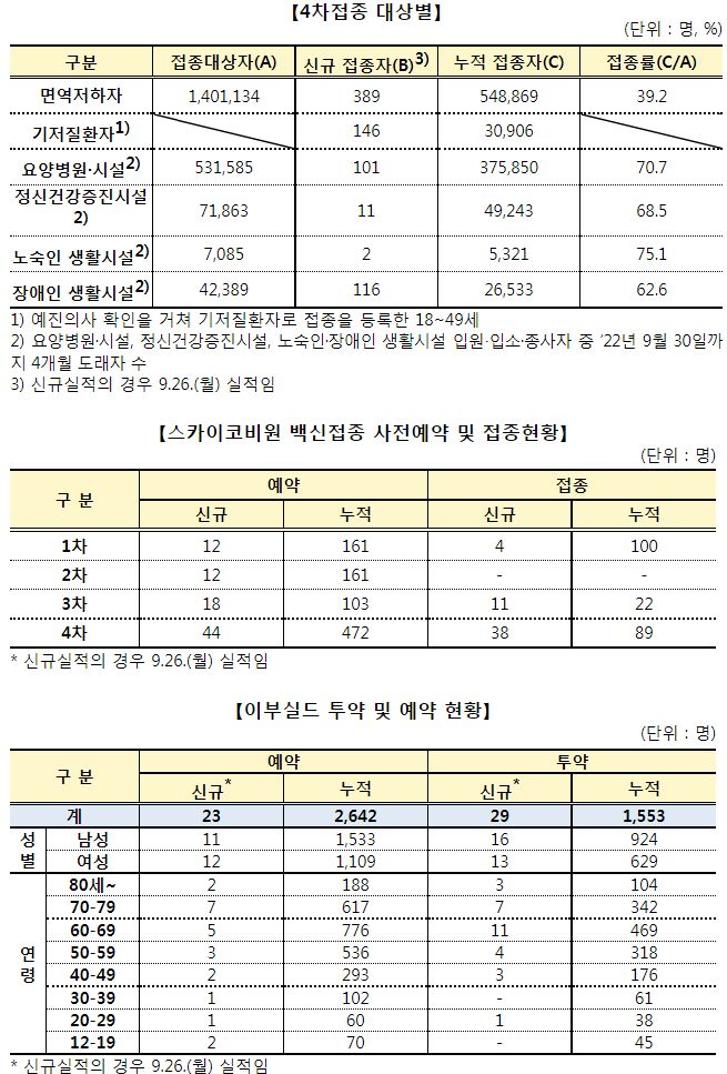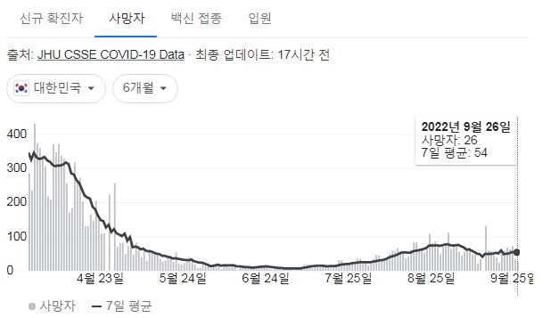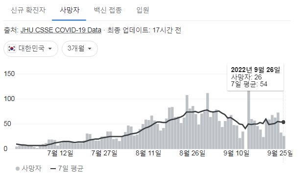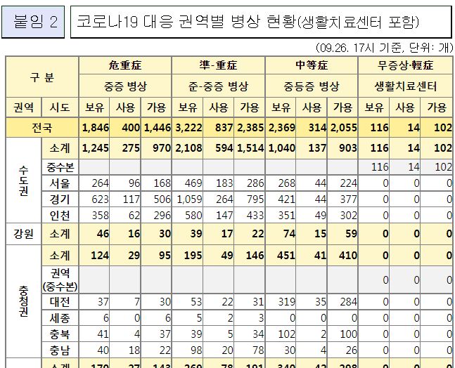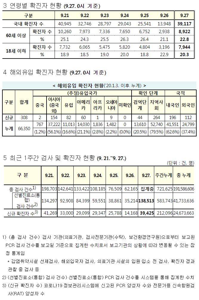 코로나19집계(2022.9.27. 0시기준) 확진 +3.9만, 사망 +26명, 중환자병상가동률 21%, 재택치료 17만 본문