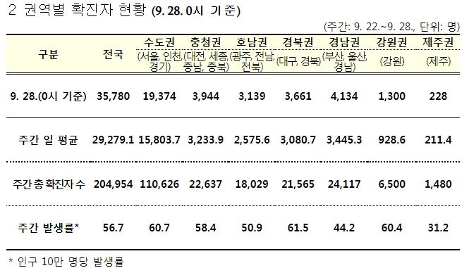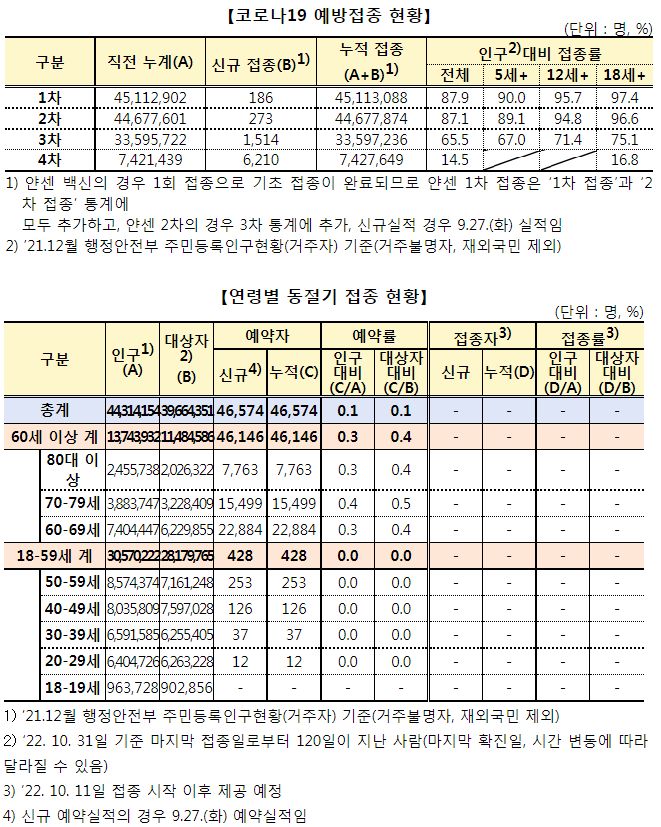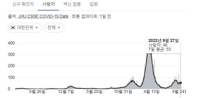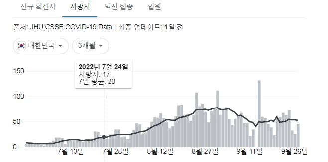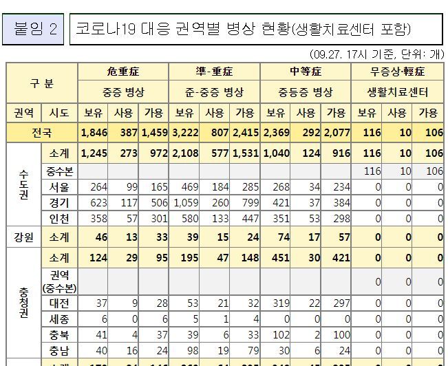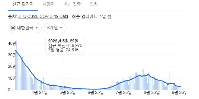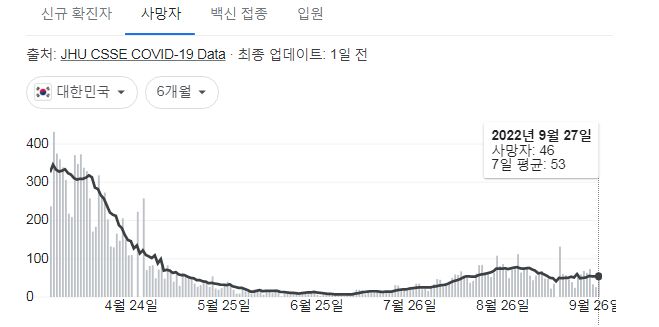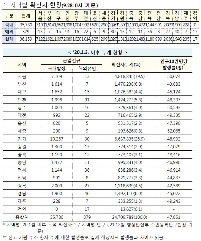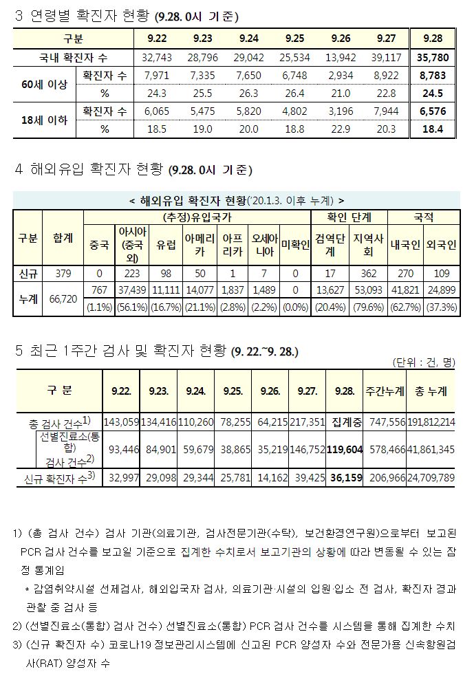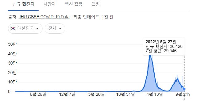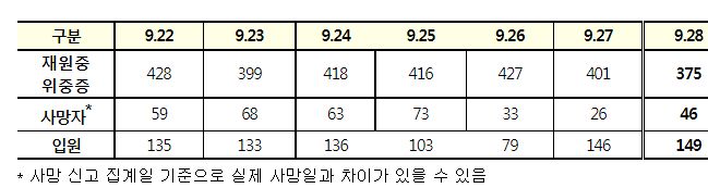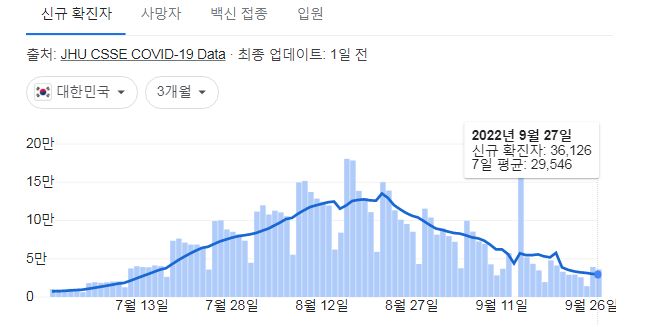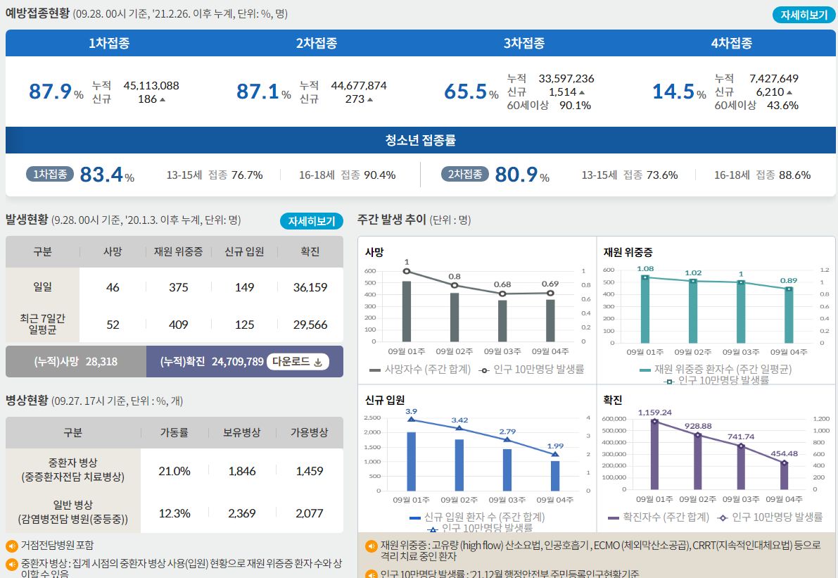 코로나19집계(2022.9.28. 0시기준) 확진 +3.6만, 사망 +46명, 중환자병상가동률 21%, 재택치료 17만 본문