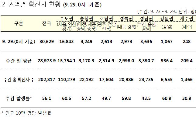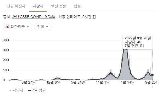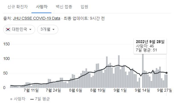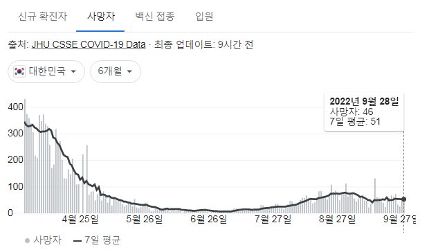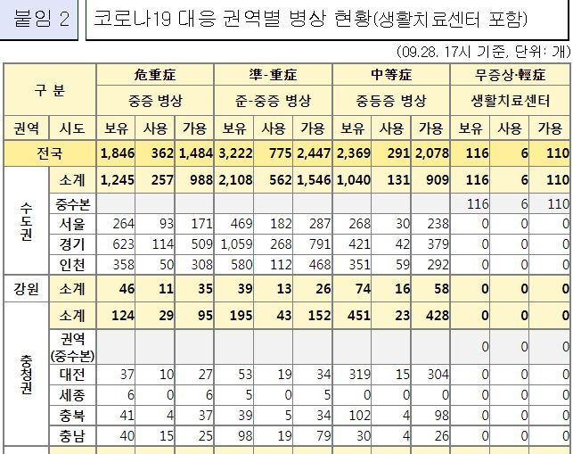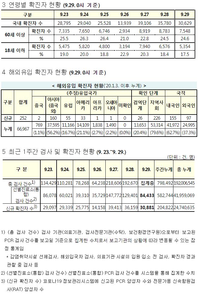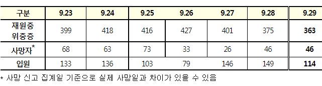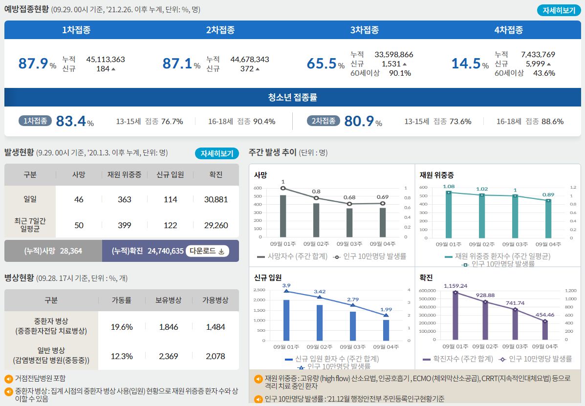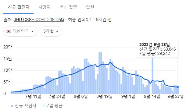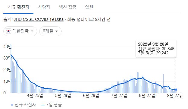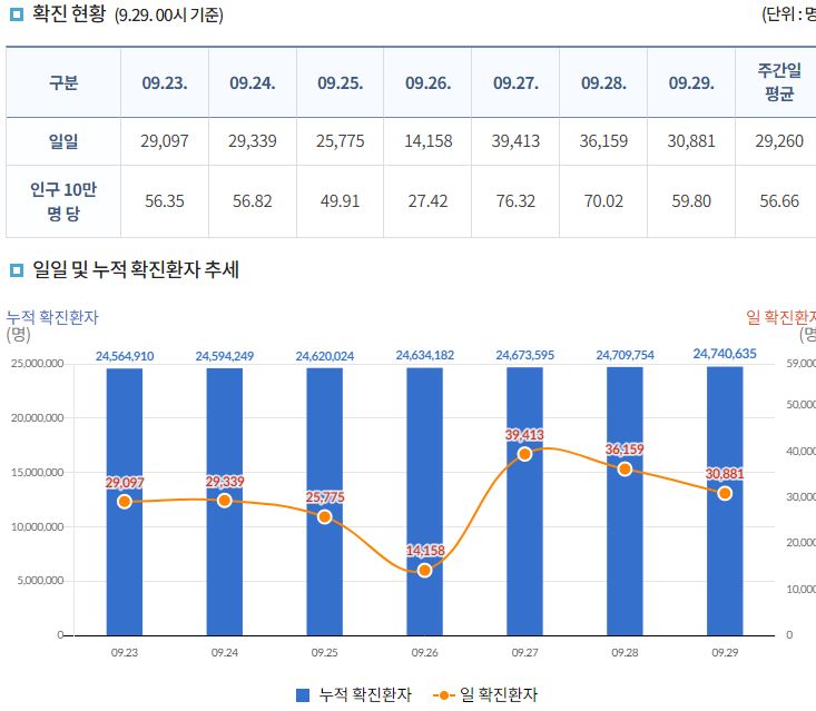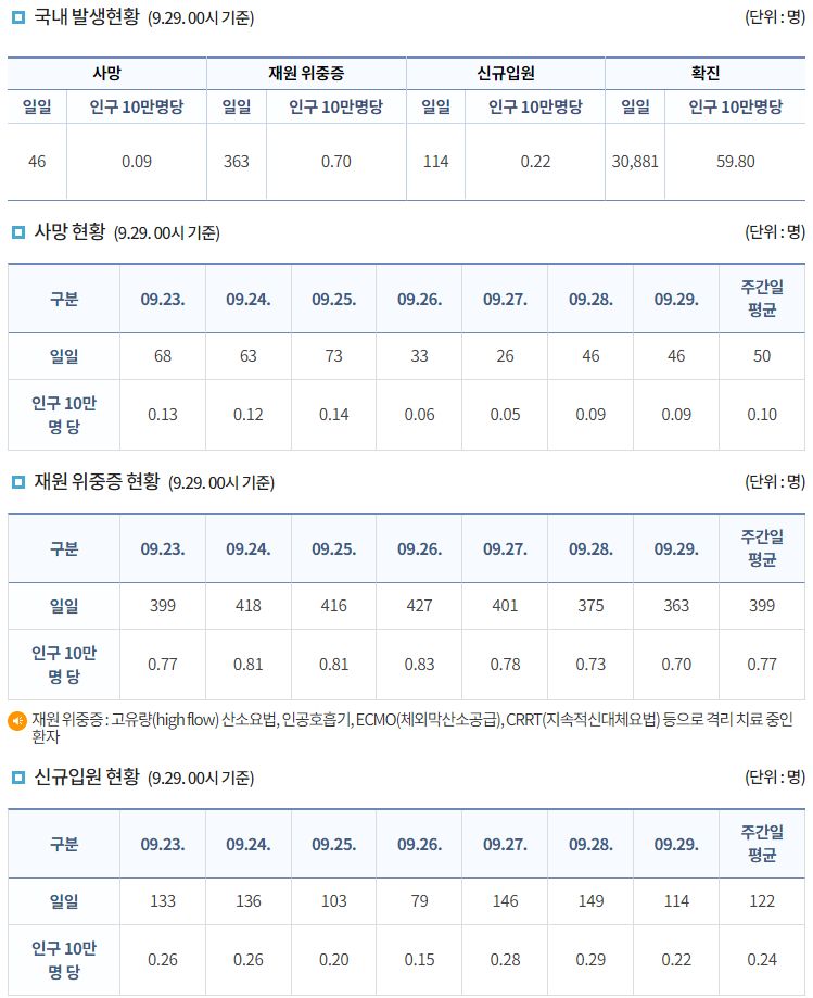 코로나19집계(2022.9.29. 0시기준) 확진 +3.1만, 사망 +46명, 중환자병상가동률 +20%, 재택치료 17만 본문