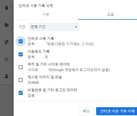 구글 크롬, 인터넷 사용기록, 캐시 삭제 기능 개선희망점: 사이트 필터/:/ 쿠키검색 삭제기능 본문