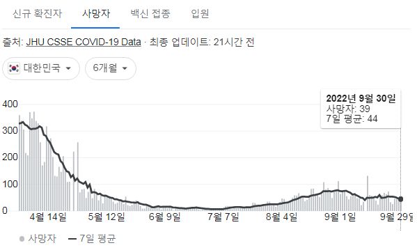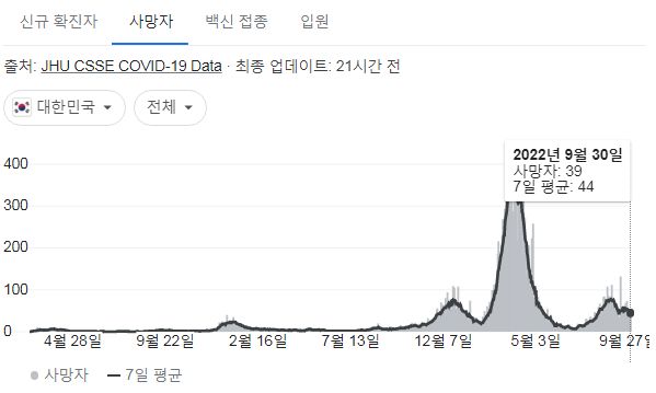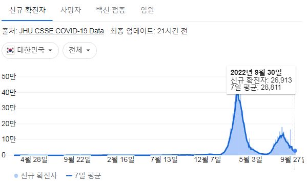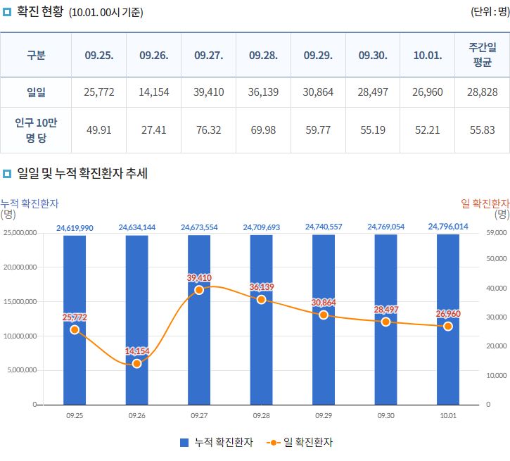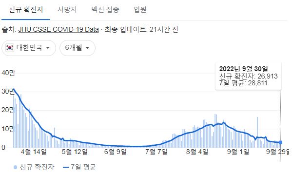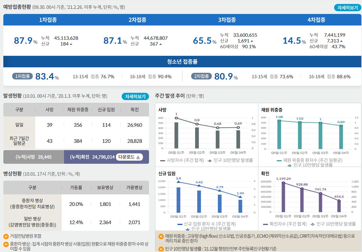 코로나19집계(2022.10.1. 0시기준) 확진 +2.7만, 사망 +39명, 중환자병상가동률 20% 본문