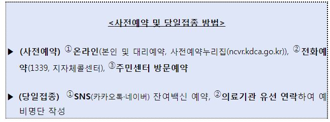 ㅡ (60세 이상) 온라인 및 1339 콜센터 등 전화, 주민센터 방문을 통한 사전예약이 가능하며, SNS와 예비명단을 활용한 당일접종 가능