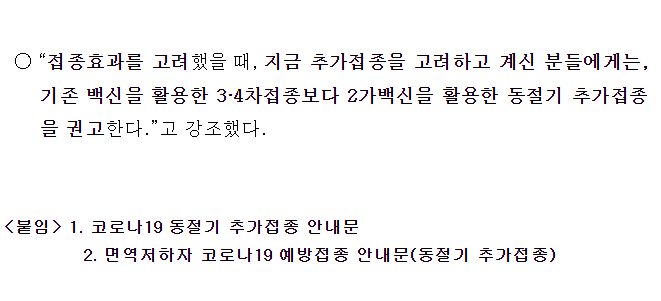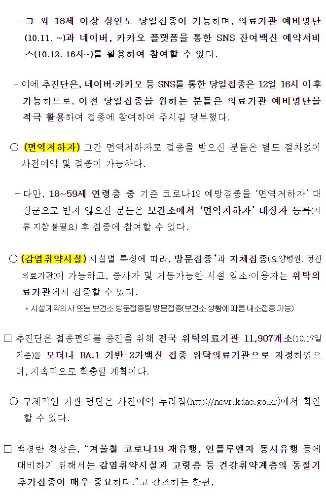 2022.10.6. 동절기 추가접종 안내: 60세 이상 연령, 건강취약계층, 면역저하자, 취약시설, 입원/입소/종사자 등 먼저.