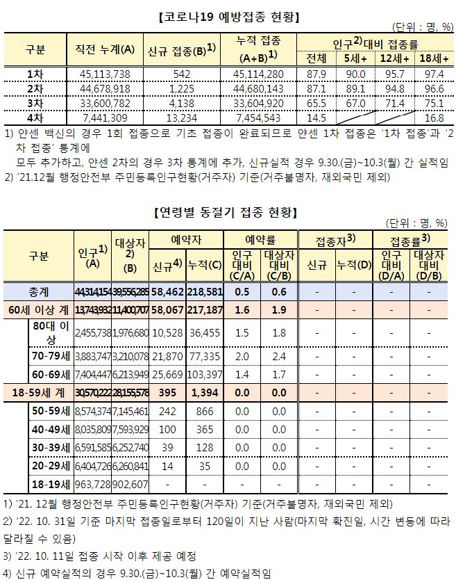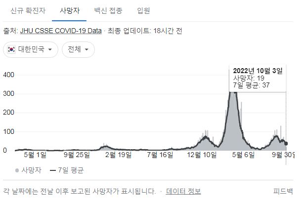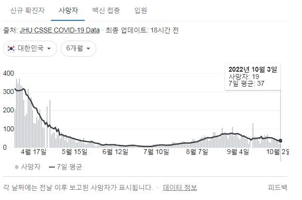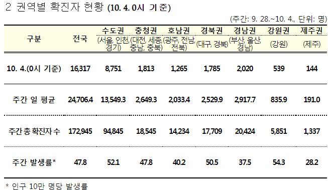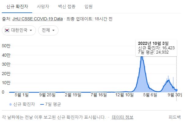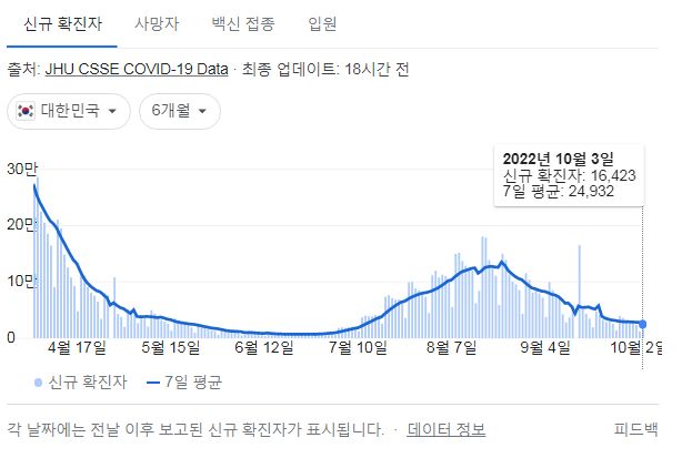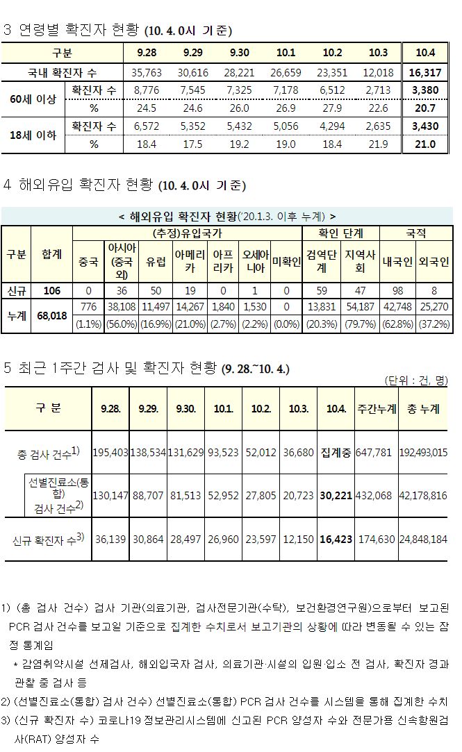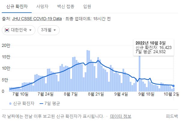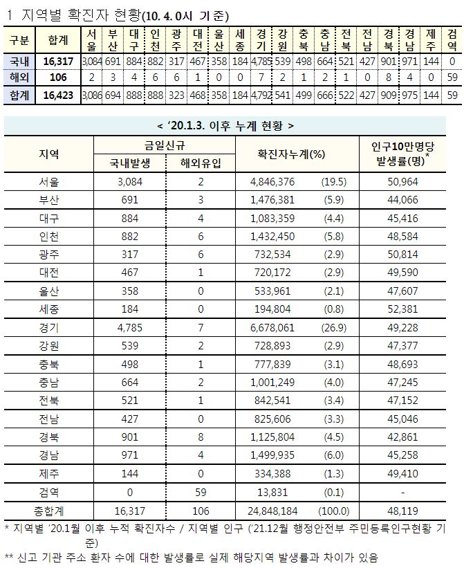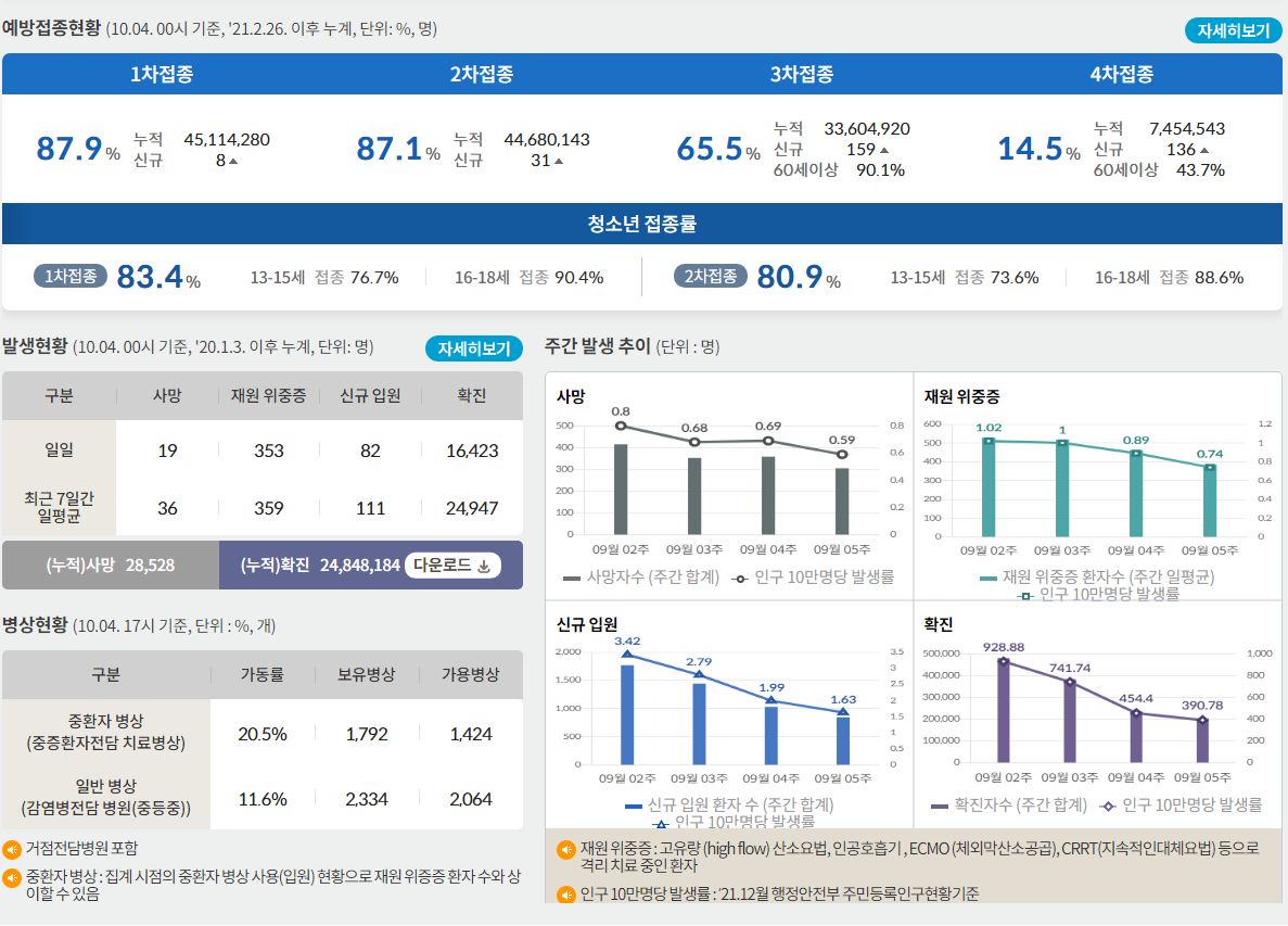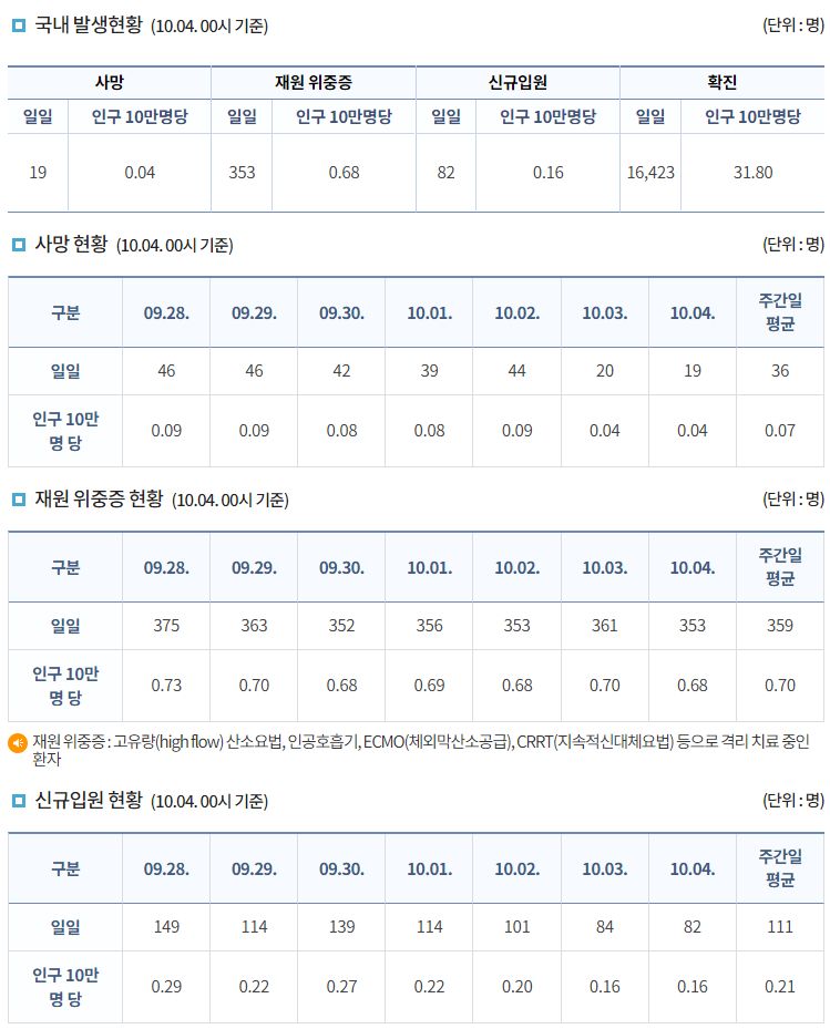 코로나19집계(2022.10.4. 0시기준) 확진 +1.6만, 사망 +19명, 중환자병실가동률 21%, 재택치료 14만 본문