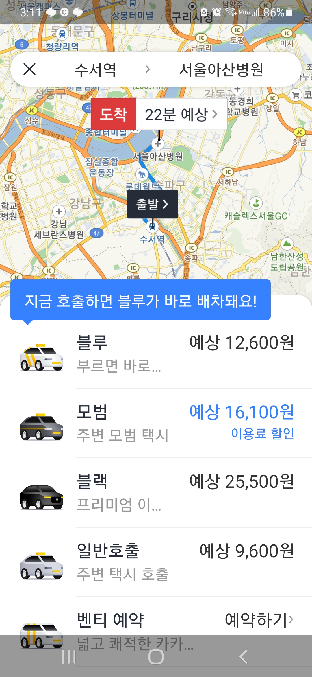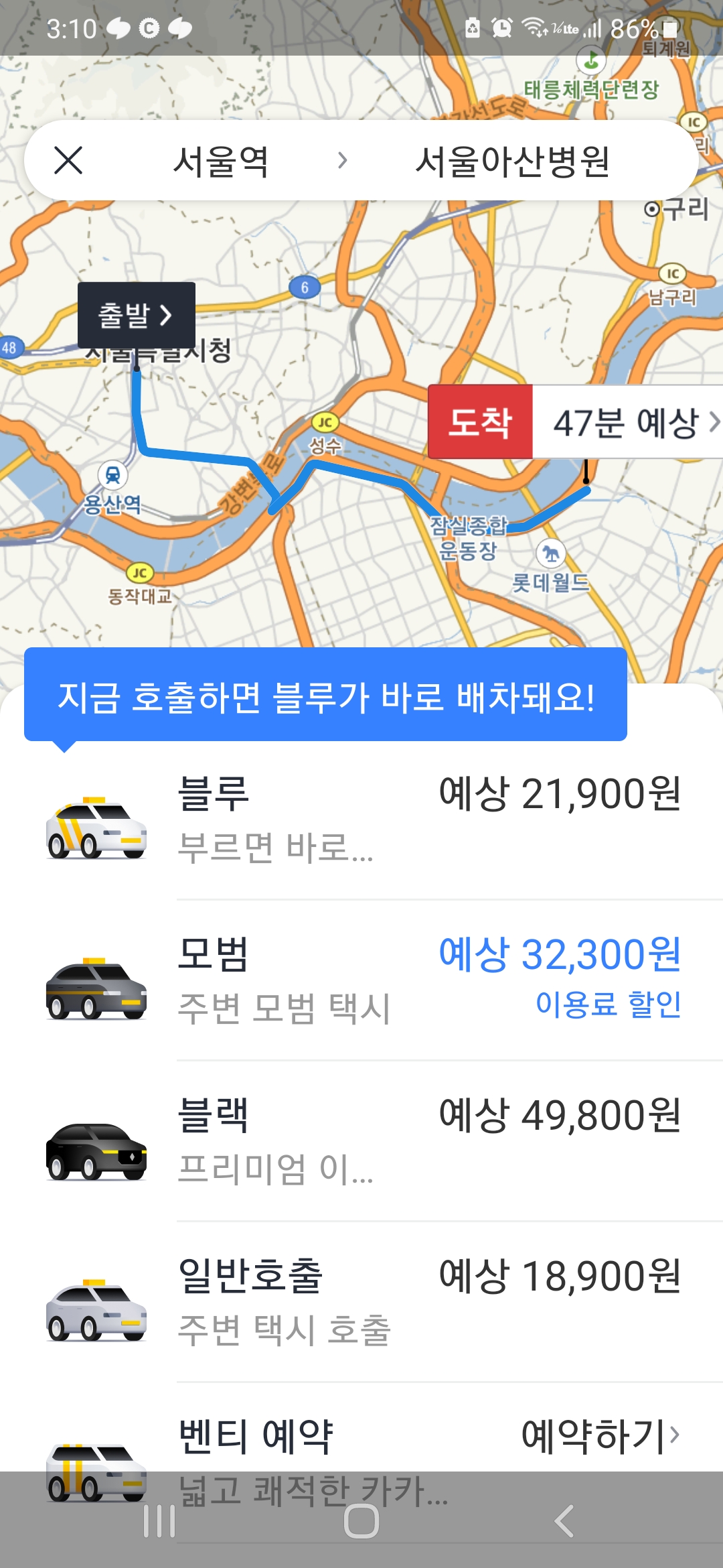 수서역과 서울역에서 서울아산병원까지, 카카오T앱 택시비예상 본문