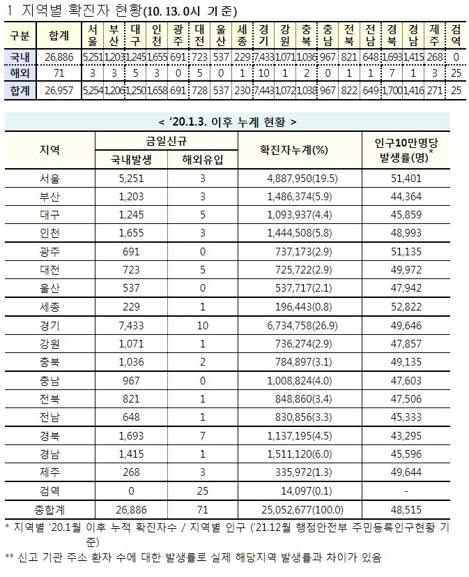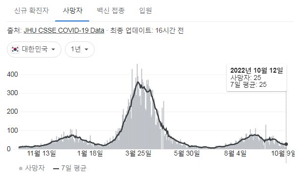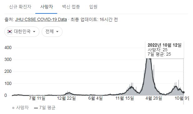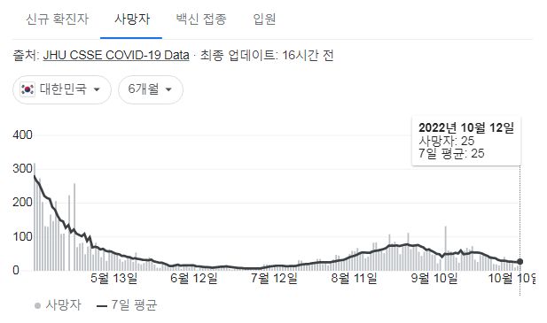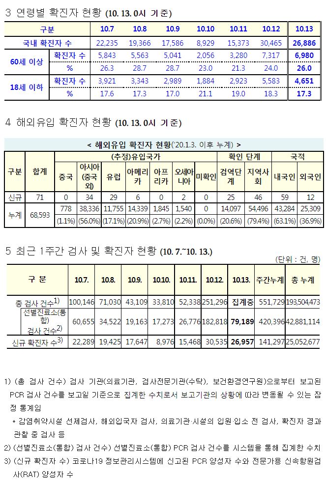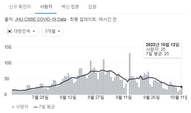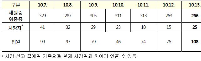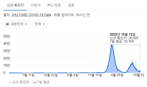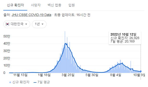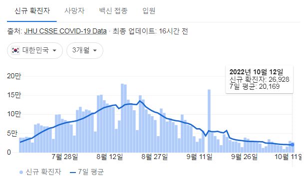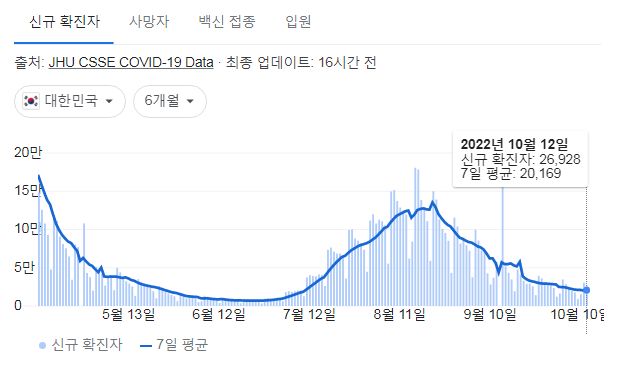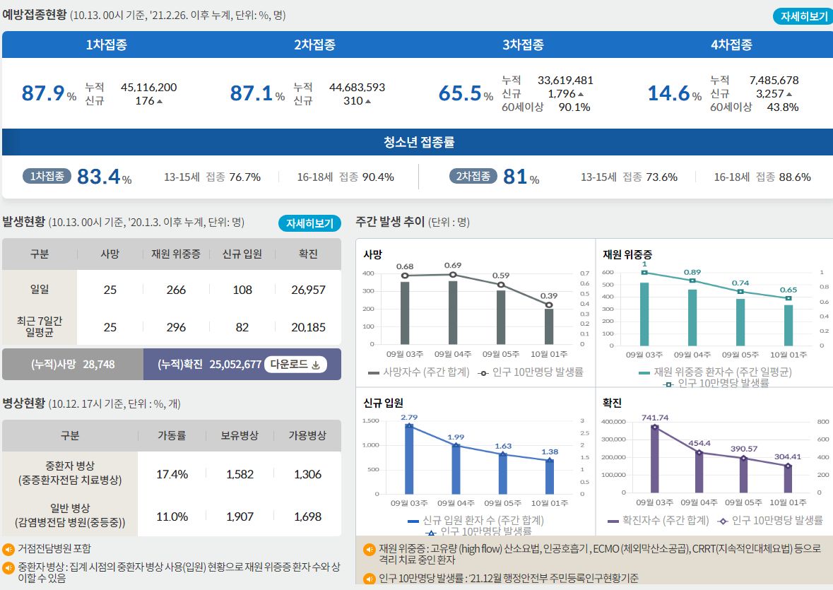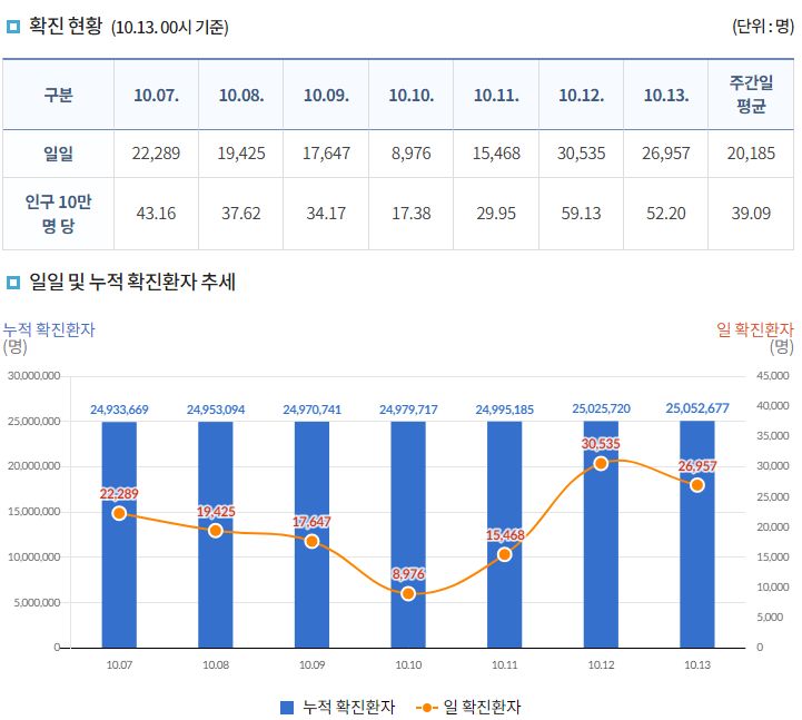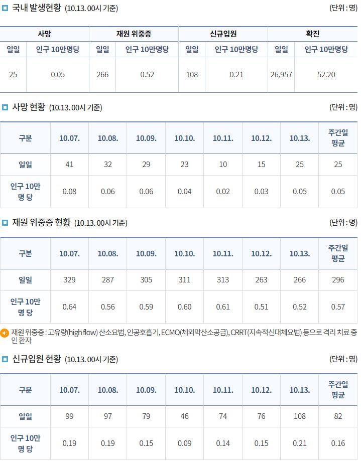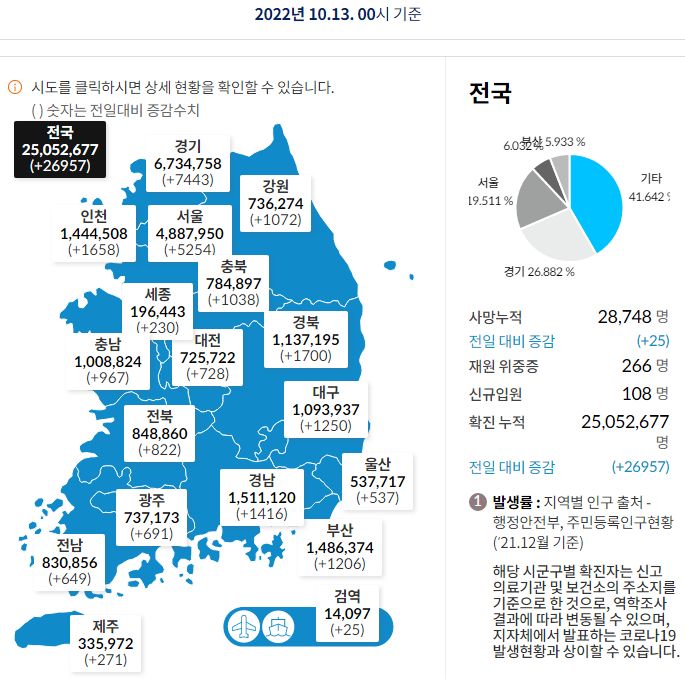 코로나19집계(2022.10.13. 0시기준) 확진 +2.7만, 사망 +25명, 중환자병상가동률 17%, 재택치료 12만 본문