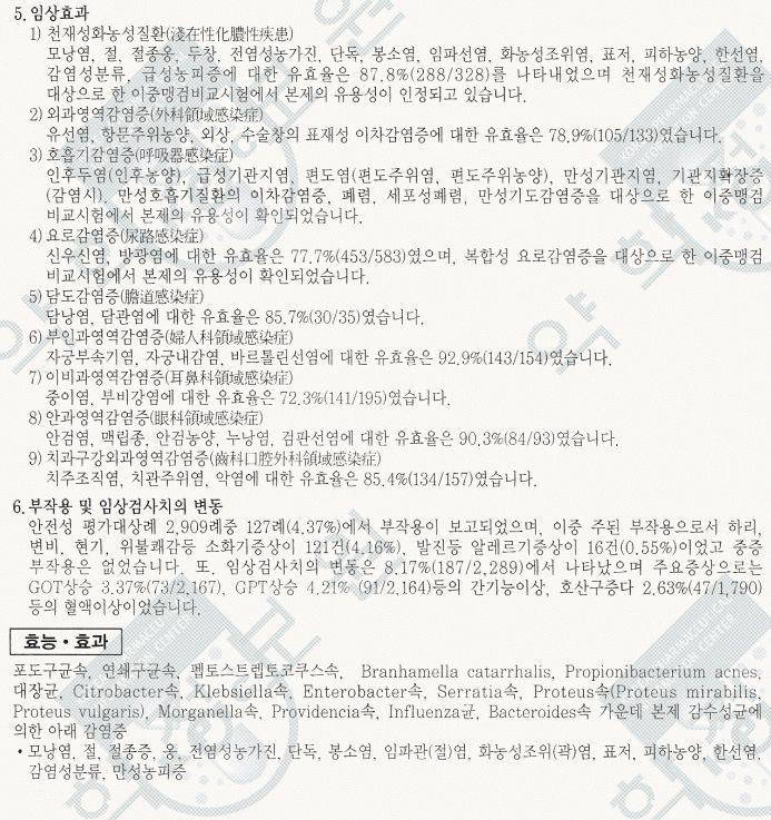 ㅡ 유효균종: 포도구균속, 연쇄구균속, 펩토스트렙토코쿠스속, 모락셀라 카타랄리스, 프로피오니박테륨 아크네스, 대장균, 시트로박터속, 클렙시엘라속, 엔테로박터속, 세라티아속, 프로테우스속(프로테우스 미라빌리, 프로테우스 불가리스), 모르가넬라속, 프로비덴시아속, 인플루엔자균, 박테로이데스속, 폐렴구균, 프레보텔라속 가운데 이 약 감수성균에 의한 아래 감염증