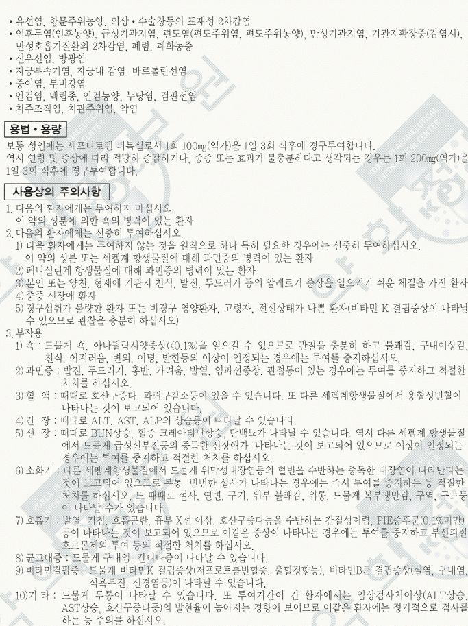 성인 : 세프디토렌피복실로서 1회 100 mg(역가)을 1일 3회 식후에 경구투여