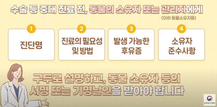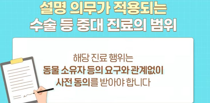 22년 7월 5일부터 모든 동물병원은 수술 등과 같은 중대 진료 전에는 동물의 소유자(또는 관리자)에게 구두로 설명하고, 서명 또는 기명날인을 받아야 합니다.