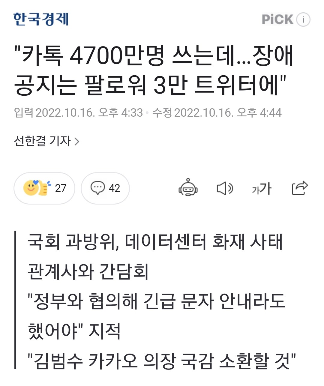 훑어본 기사 몇 가지 중 일부에서는, 만약 정부가 기간망처럼 책임을 지우겠다면 이런 특별한 장애는 재난문자로 뿌리는 게 좋겠다거나, 카카오는 왜 그 쪽을 협의하지 않았냐 지적했는데요..
