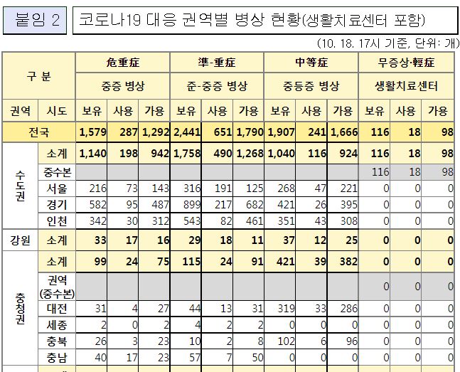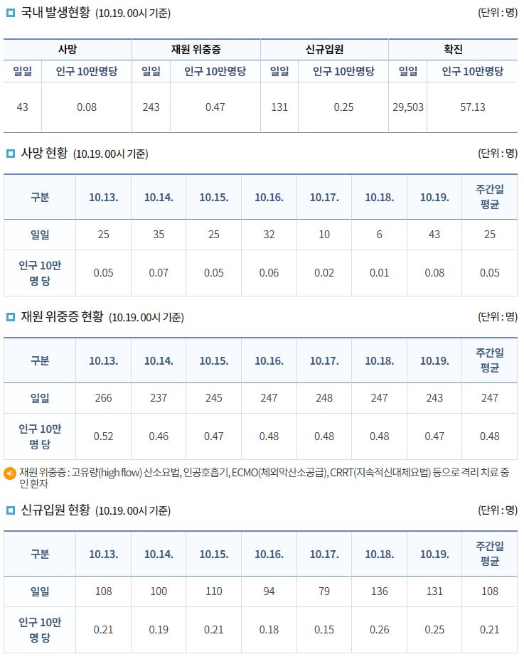 코로나19집계(2022.10.19. 0시기준) 확진 +3만, 사망 +43명, 중환자병상가동률 18%, 재택치료 14만 본문