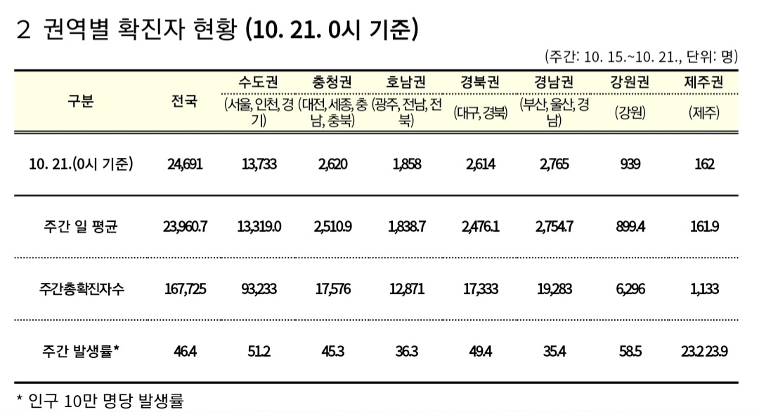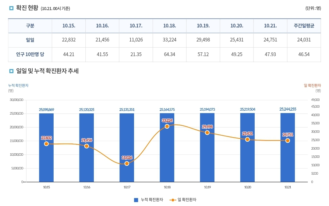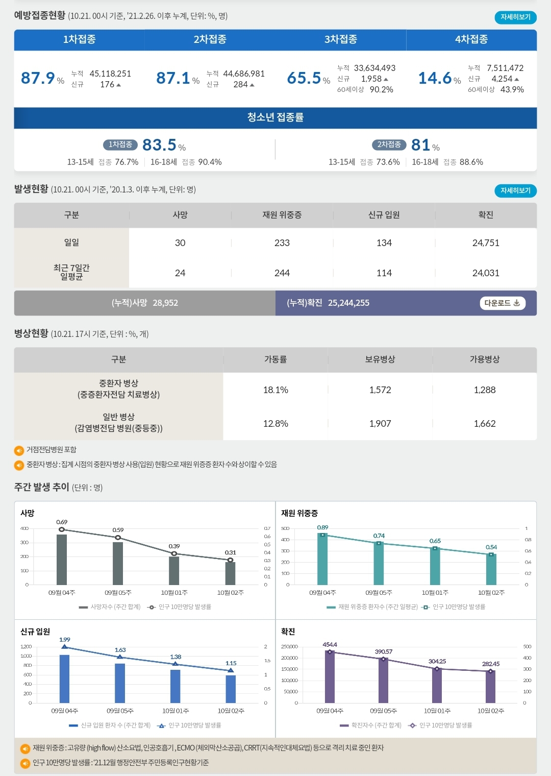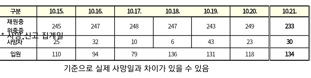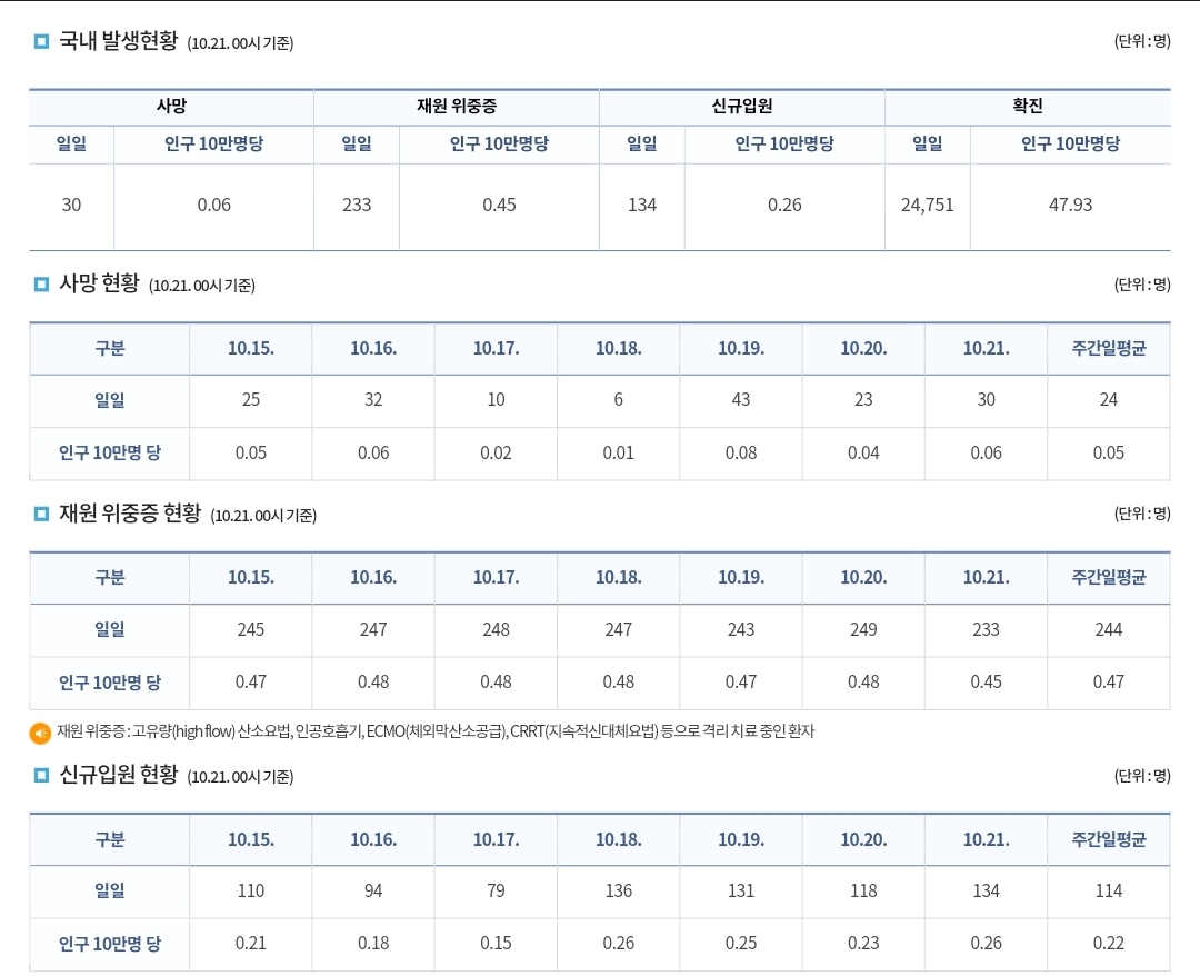코로나19집계(2022.10.21. 0시기준) 확진 +2.5만, 사망 +30명, 중환자병상가동률 18%, 재택치료 14만 본문