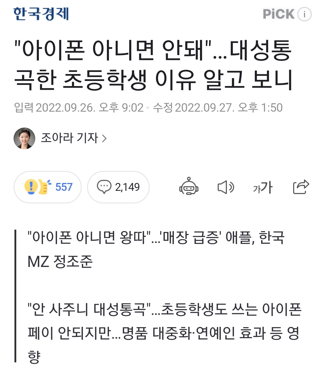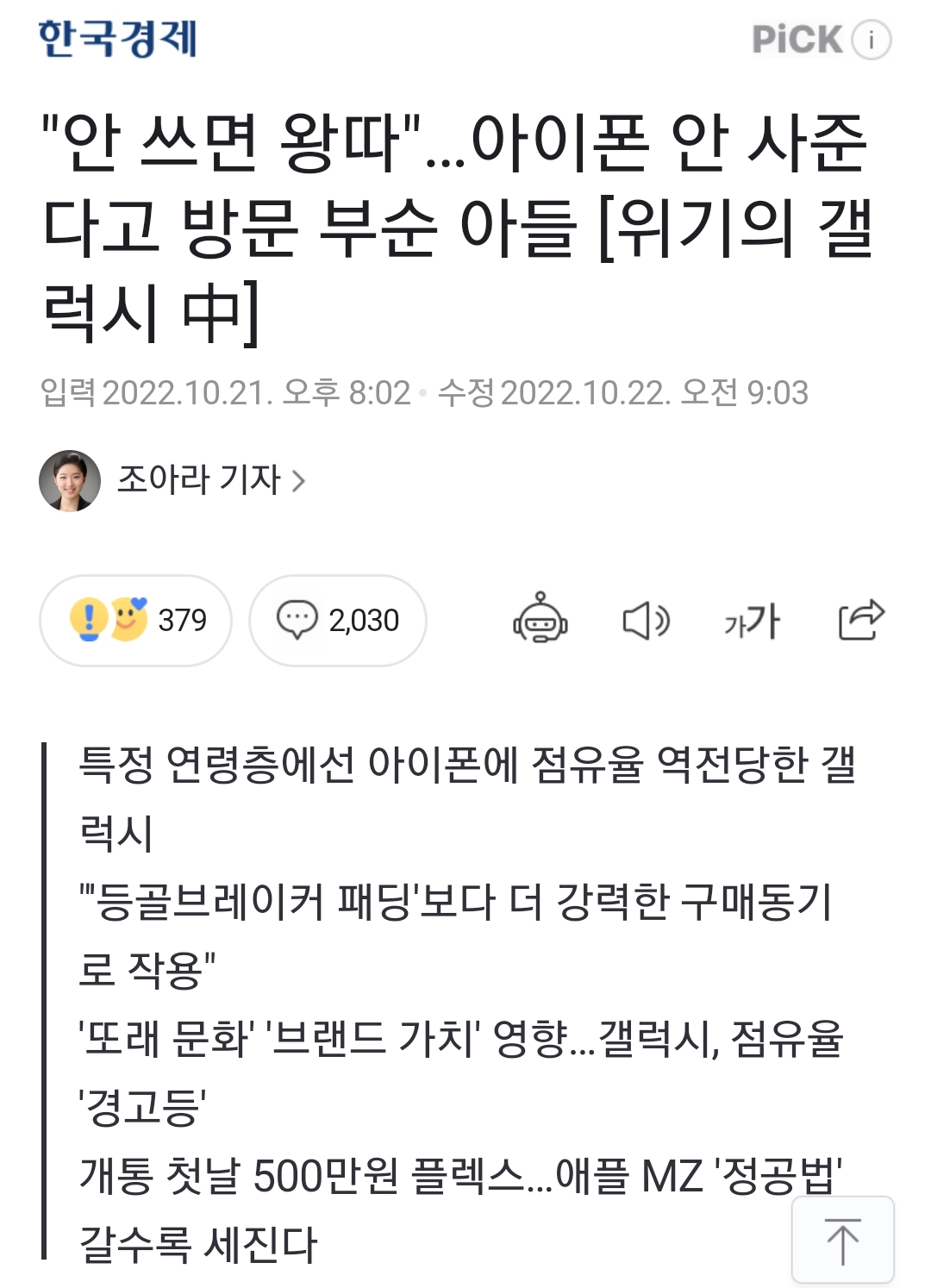 '1020의 유별난 아이폰 선호'를 말한 내용은 온라인 커뮤니티에서는 전부터 딱히 반론이 없다는 생각이 드는데, 검색해보니 꽤 전 기사도 나오네요. 아래 한국경제신문의 최근 연재기사는 청소년이야기로 시작하지만 성인 세대의 이야기기도 합니다. '그 아이가 커서 어른이 되고 있다'는 말도 나옵니다.