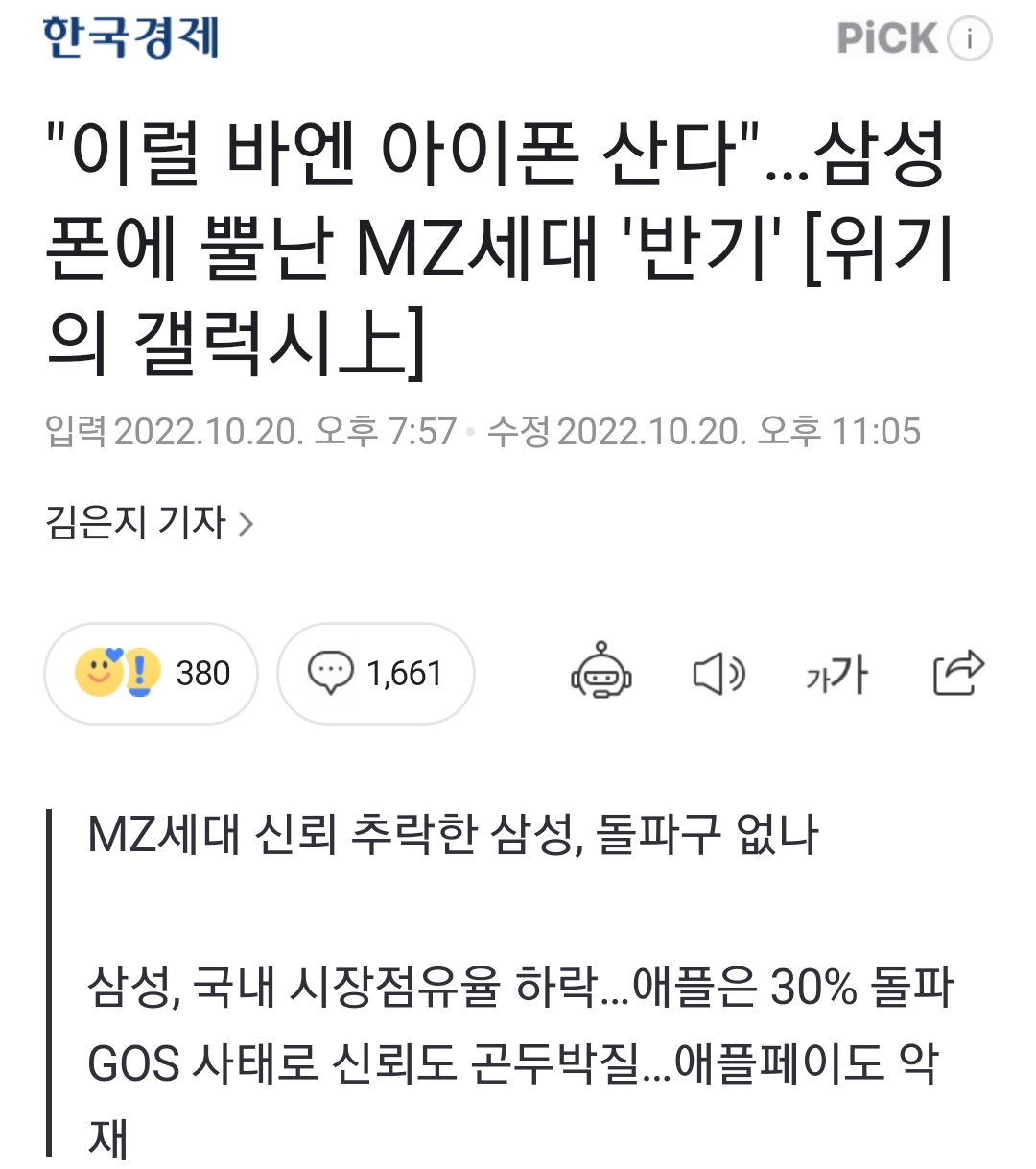 ㅡ "아이폰이 국내 시장에서 (MZ세대부터) 알파세대(2010년 이후 출생자)까지 사로잡았다는 점에서 전문가들은 자칫 한순간에 애플이 삼성을 따라잡을 수 있다고 경고"