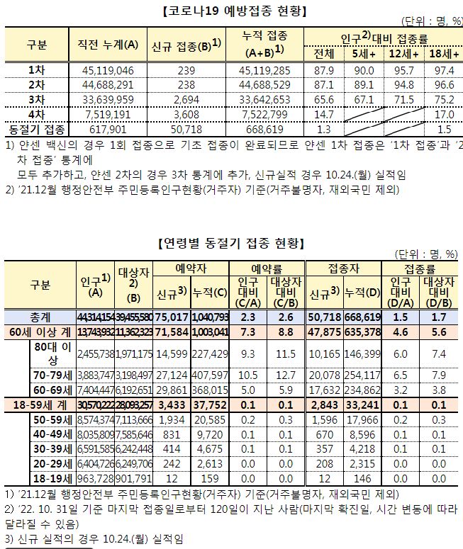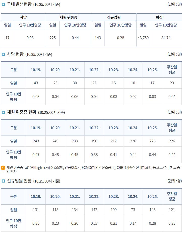 코로나19집계(2022.10.25) 확진 +4.4만, 사망 +17명, 중환자병상가동률 21%, 재택치료 15만 본문