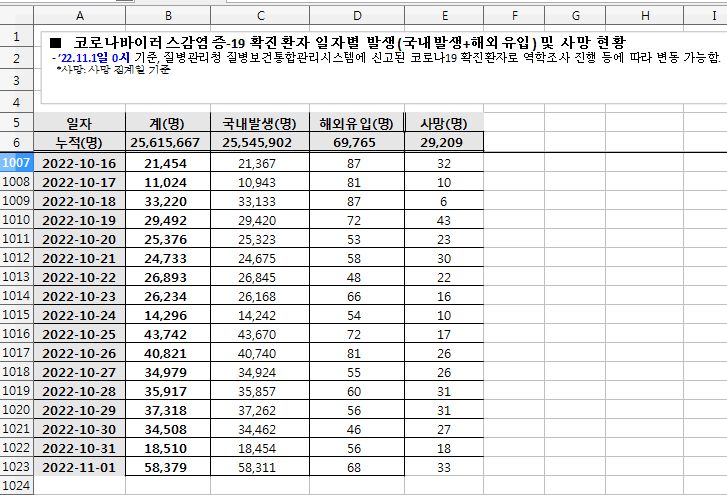 | 코로나19집계(2022.10.31. 0시기준) 확진 +1.9만, 사망 +18명, 중환자병상가동률 25% (0) | 2022.10.31 |