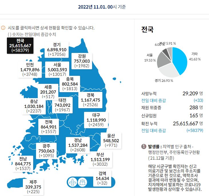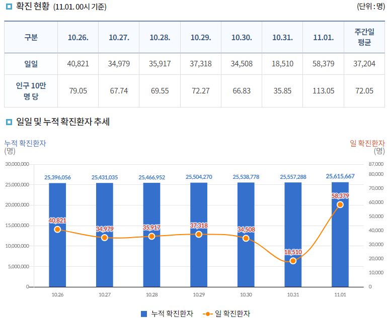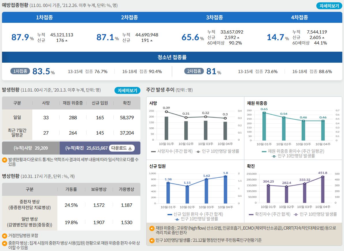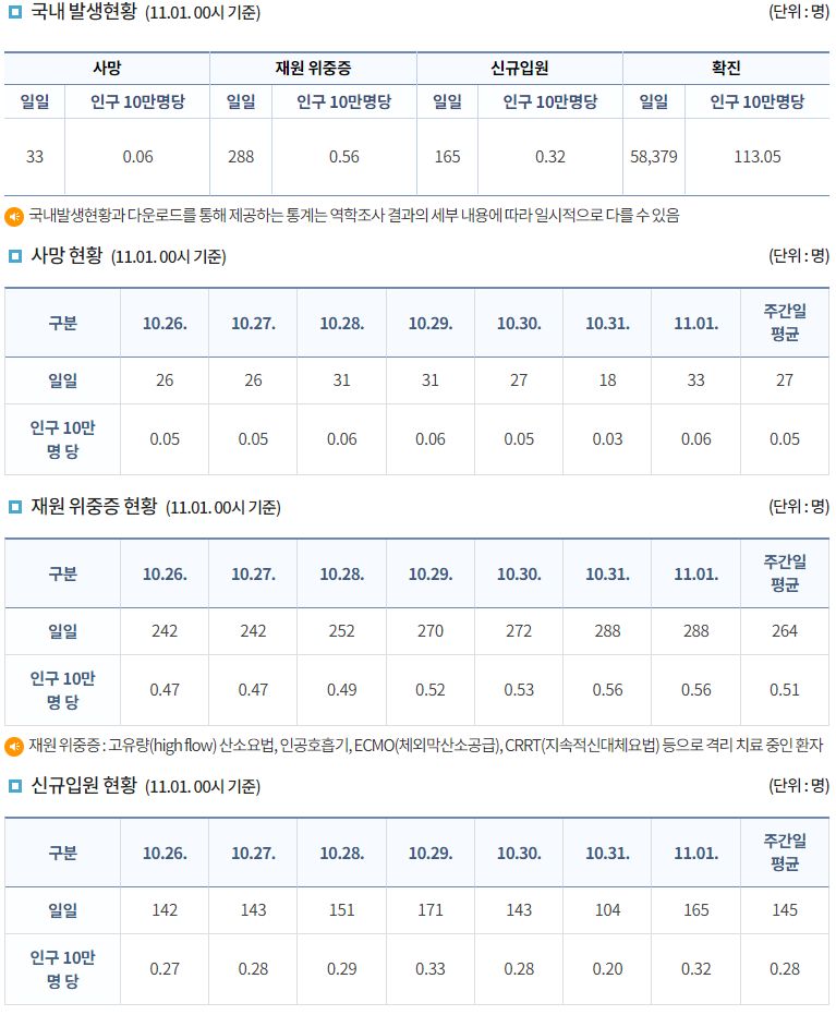 코로나19집계(2022.11.1. 0시기준) 확진 +5.8만★, 사망 +33명, 중환자병상가동률 25%/:/ 일일확진자+사망자 그래프, 이상반응집계, 백신접종 링크 본문