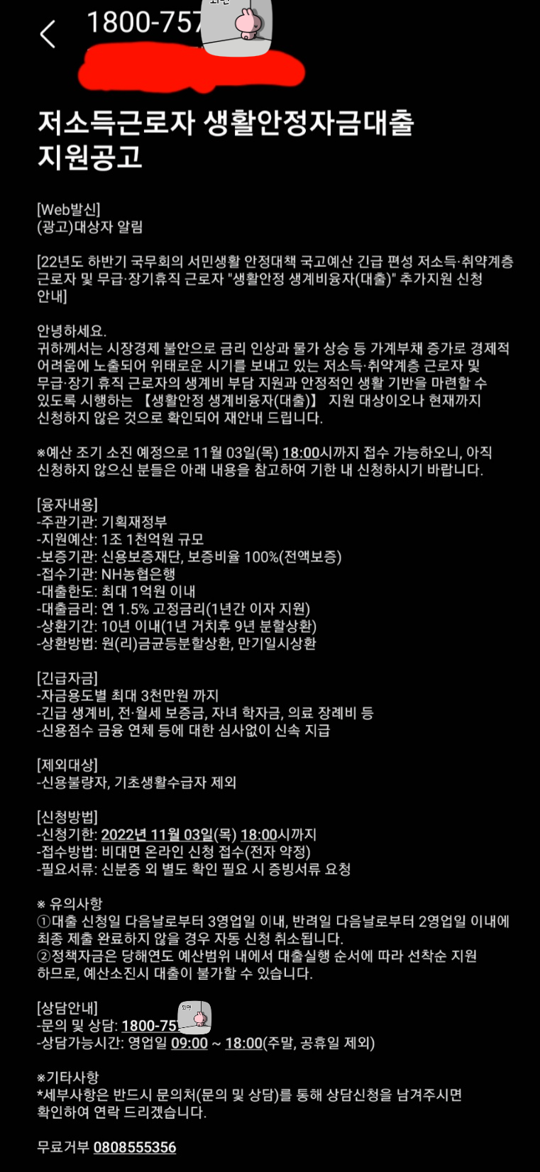 | 사기문자: "NH농협은행", "정부 추경", "생활안정자금", "생계비 부담 경감", "긴급생활자금"을 빙자한 대출 금융사기 스미싱 (3) | 2022.12.02 |