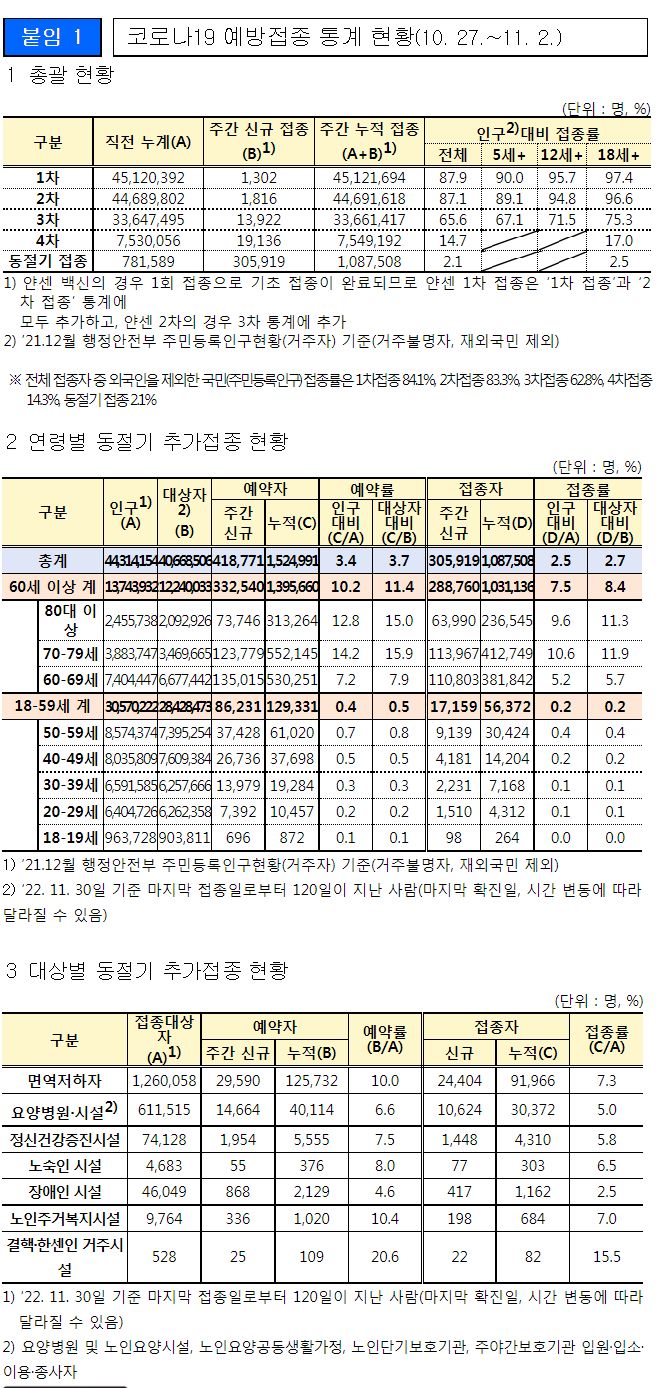 코로나19 예방접종 통계 현황(10. 27.~11. 2.)