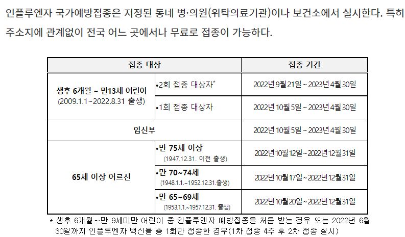 | 2022-2023 절기 어르신/어린이/임신부 인플루엔자(독감) 국가예방접종(무료) (0) | 2022.11.09 |