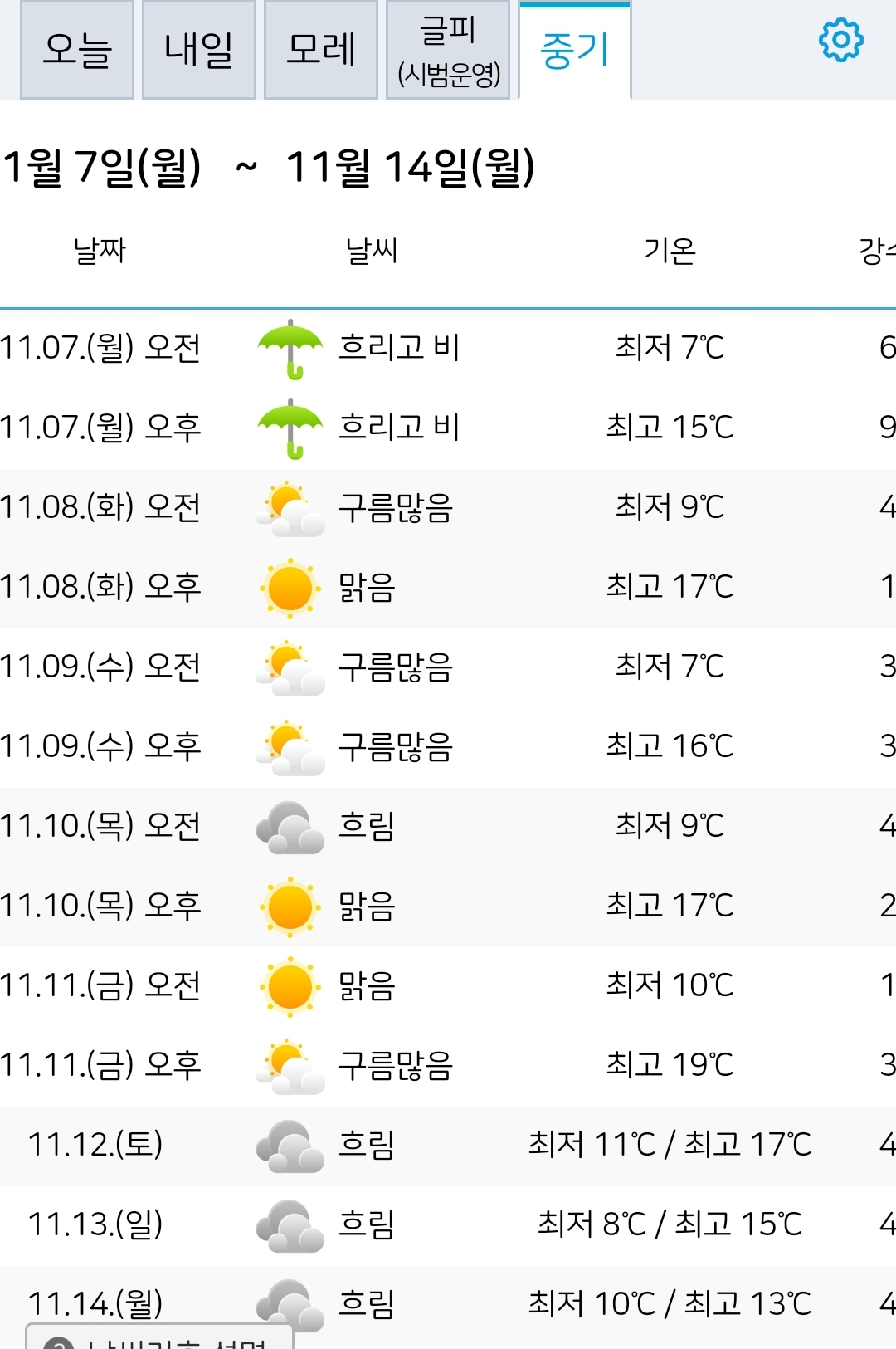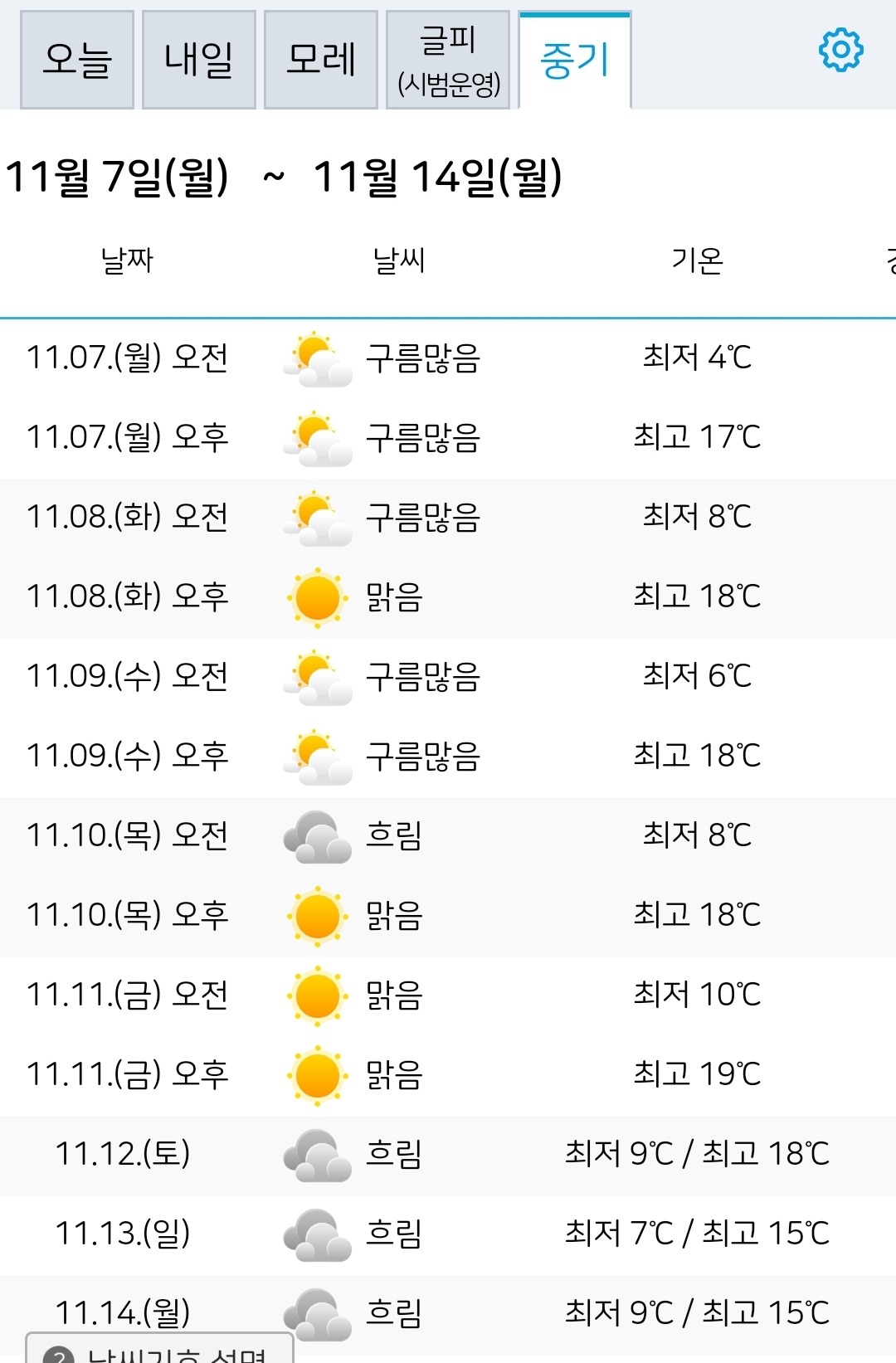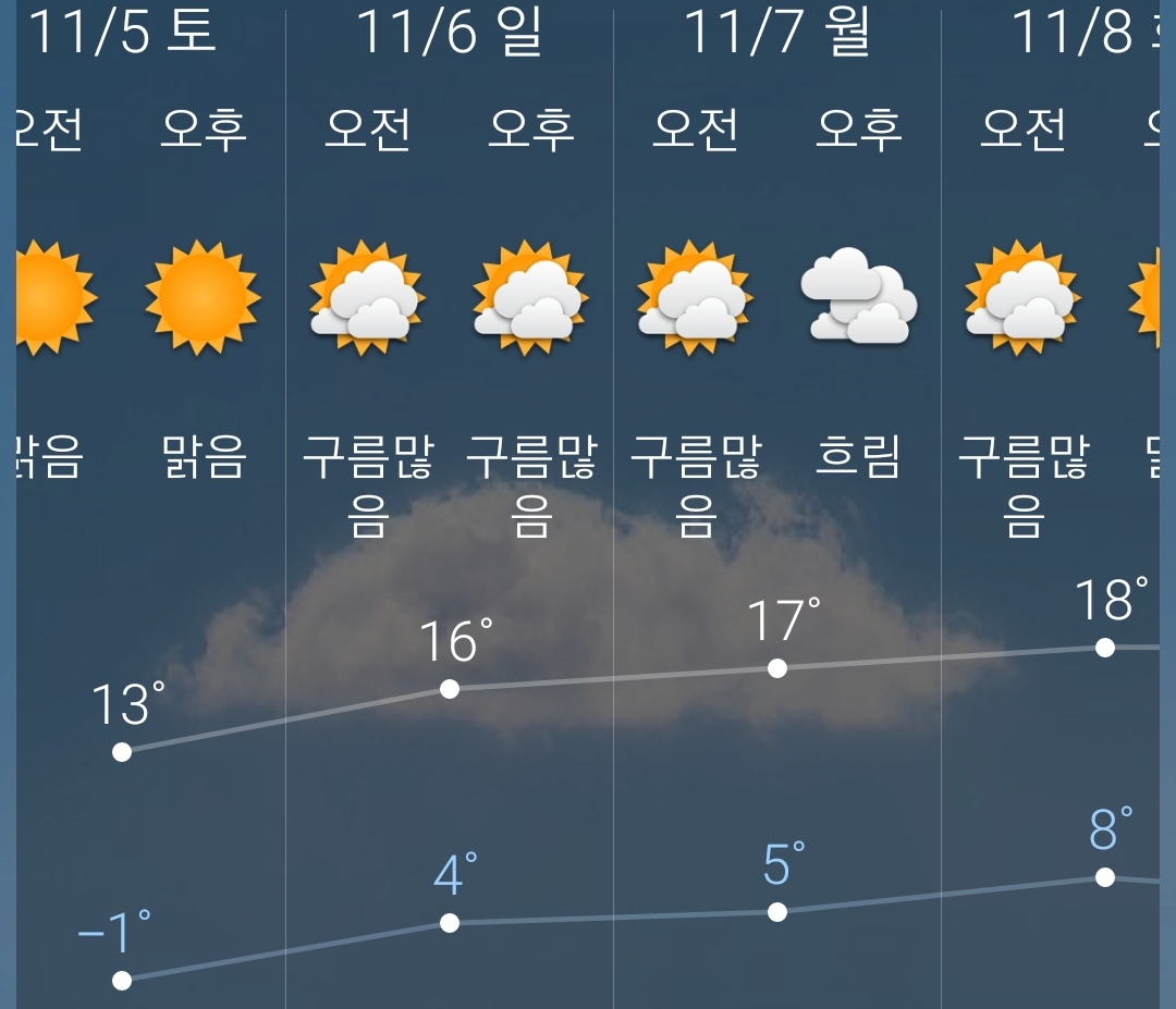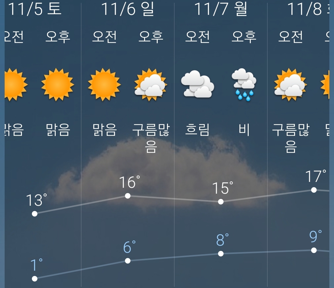 그리고 일요일부터는 살짝 오른 기온으로 슬슬 겨울로 접어드는 11월 날씨라는 모양입니다.