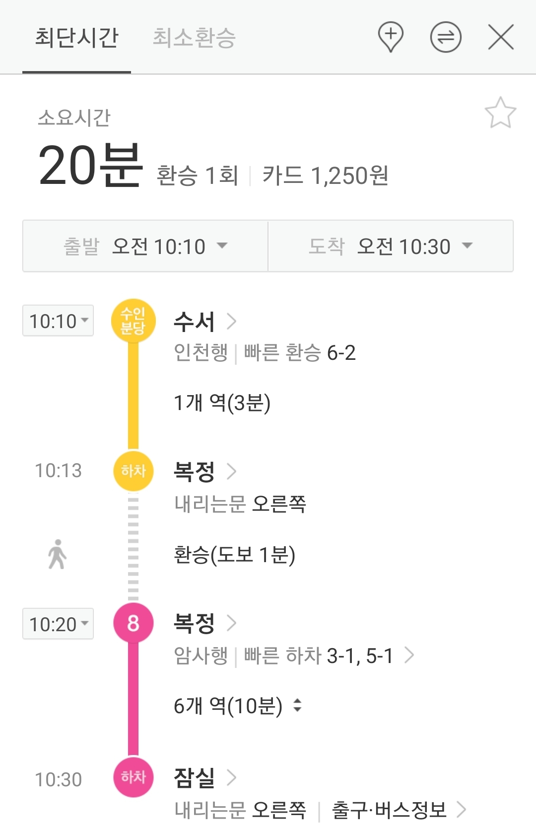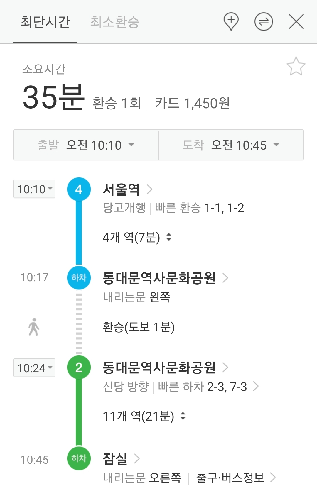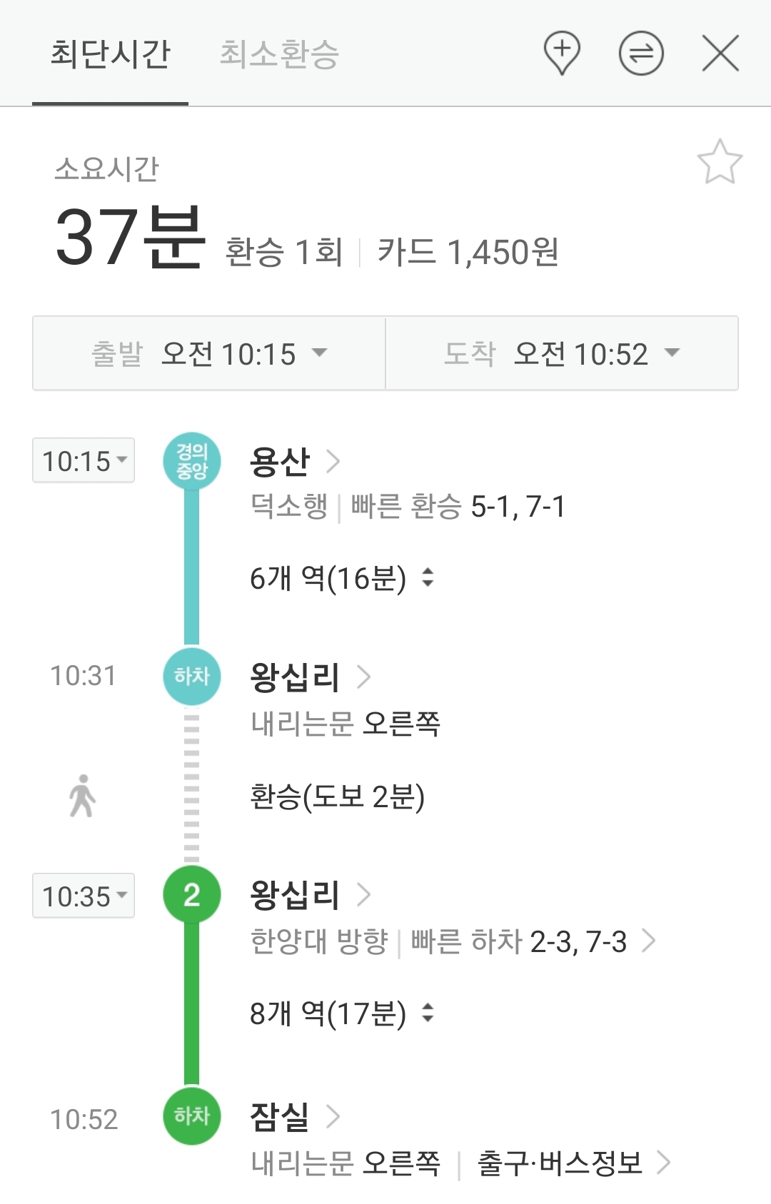※ 전철구간은 최단시간루트와 그보다 몇십 분 더 걸리는 최소환승루트가 다르게 검색된다. 다 찍어 올리면 글이 길어지니 지하철앱으로 확인하기.