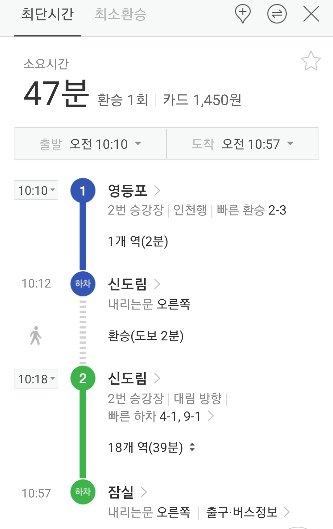 (특히 영등포역에서 내리면 영등포에서 신도림가서 대림방향 2호선 환승하는 길을 안내하는데, 평일 출근시간대 다음에는 아래와 같이 50분 정도 걸린다. 영등포역은 동선도 복잡하고 계단도 많으니 차라리 용산역이나 서울역에서 내리는 쪽이 편하다)